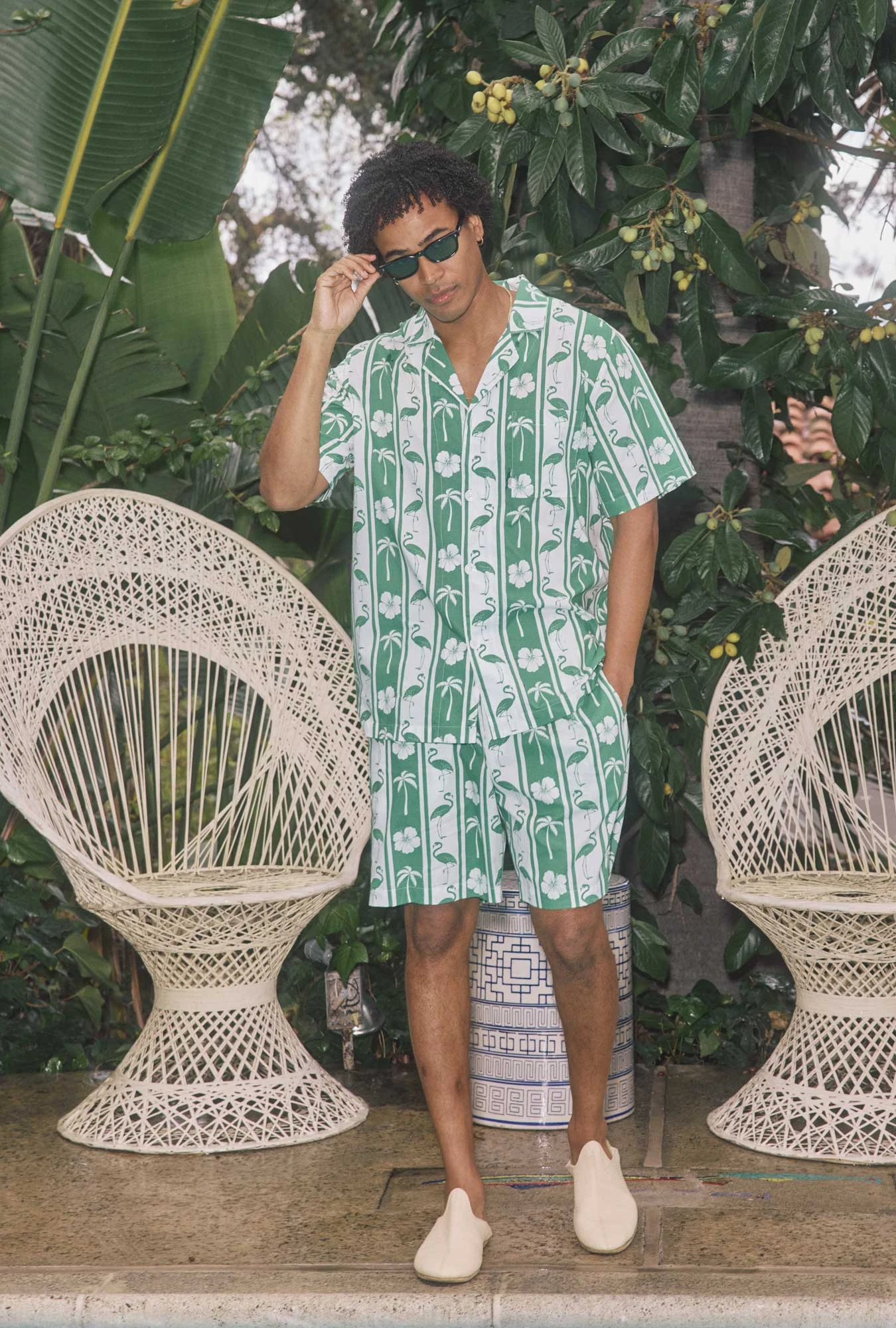 Our men’s short sleeve boxer pajama set in a tropical print is made with organically grown woven cotton poplin for ultimate comfort. The top features a notch collar and chest pocket. The pull-on shorts have an elastic waistband with drawstrings and side pockets for a relaxed fit.