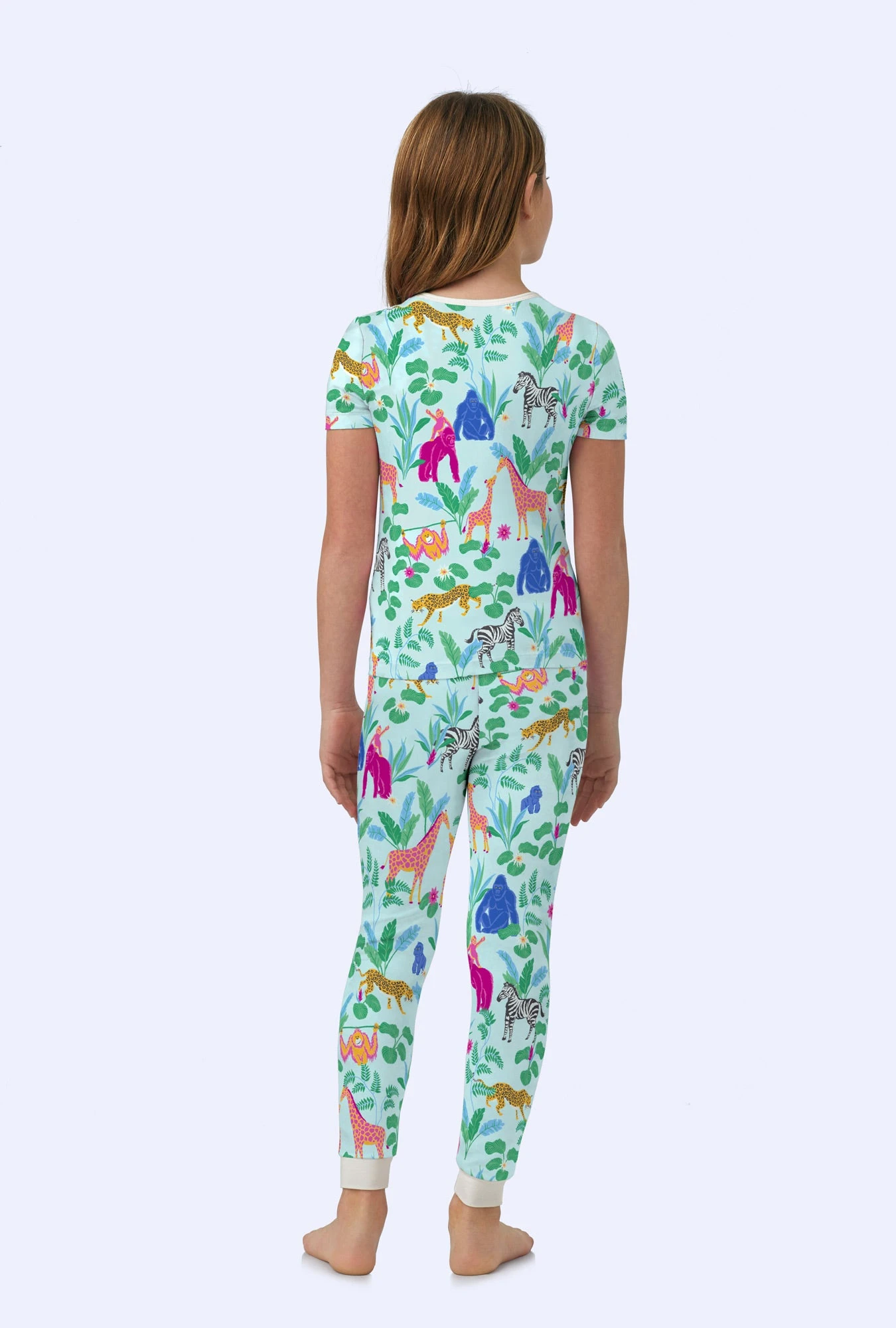 Our kids’ short sleeve pajama set brings the jungle vibes to bedtime. Made with soft organically grown cotton jersey, the top has a contrast crew neck while the pants feature an elasticated waistband. Made to keep bedtime playful and cozy.