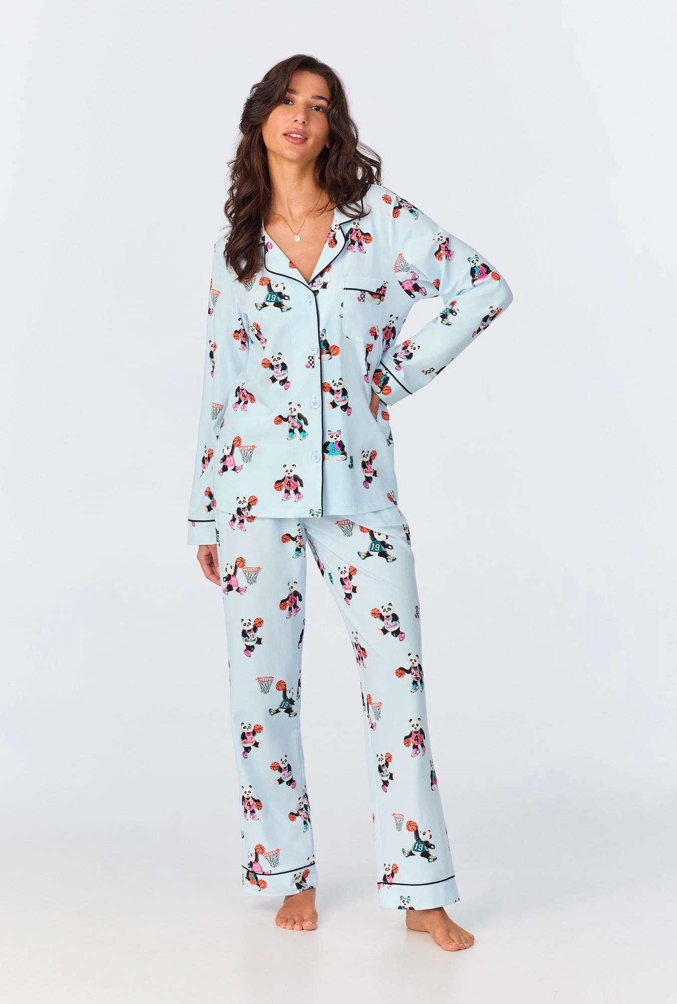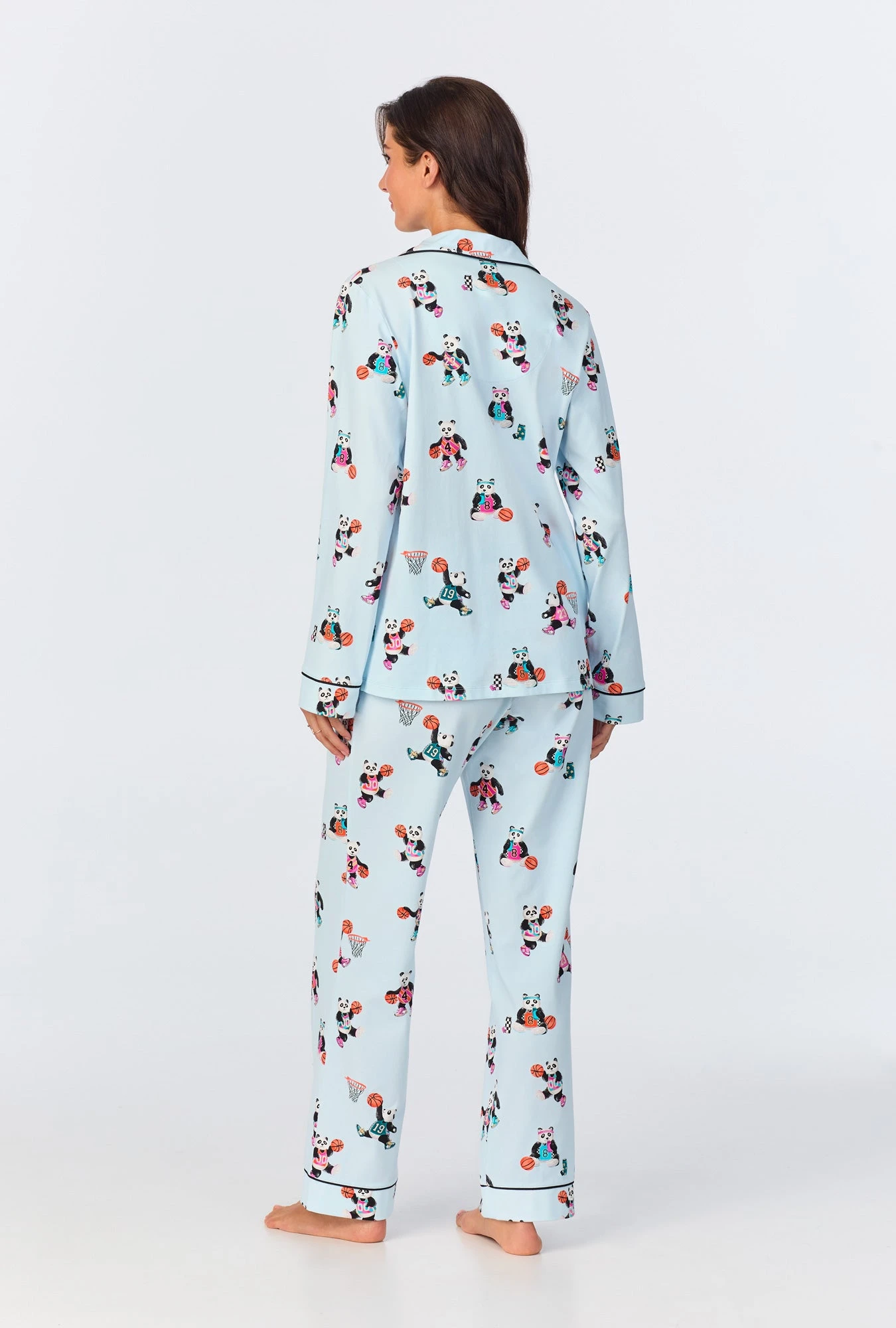 Our women’s cotton jersey long sleeve pajamas adorned with a playful blue panda print are cozy and comfortable. Contrast black knit piping at collar and cuffs, a notch collar, and chest pocket tailor the look; and pull-on pant with an elastic waistband and pockets make for easy extended wear.