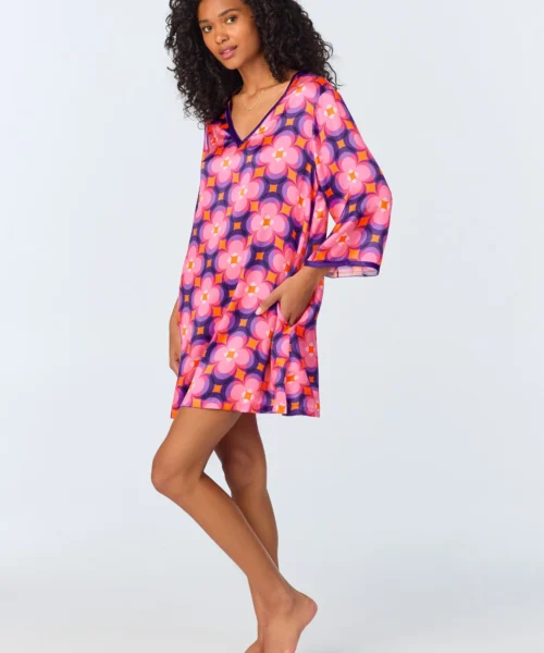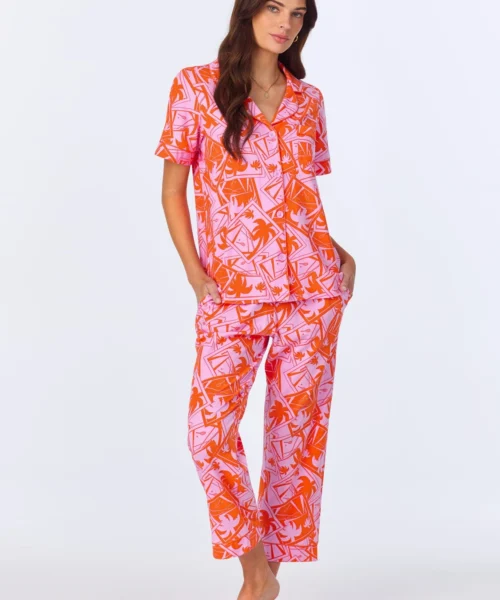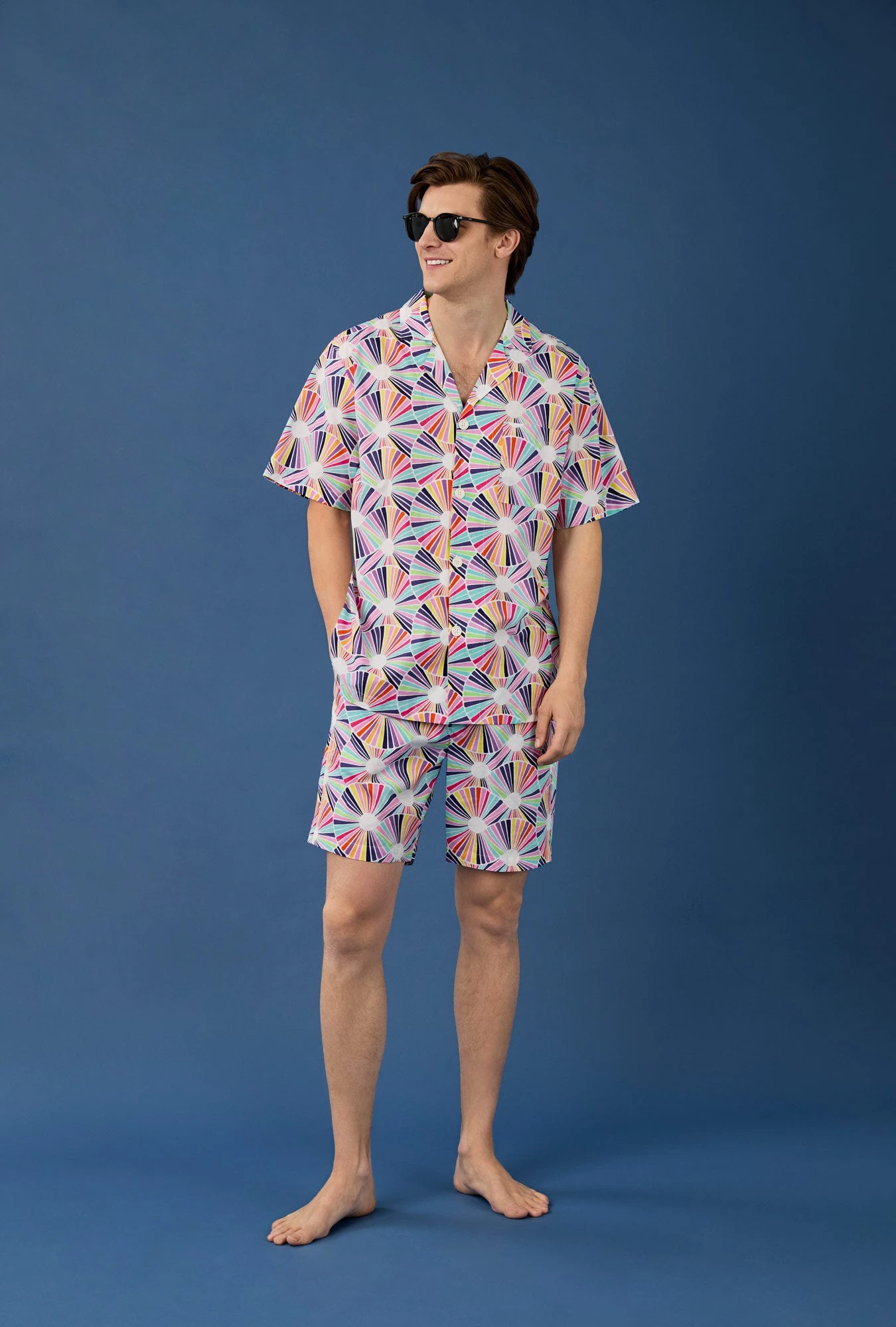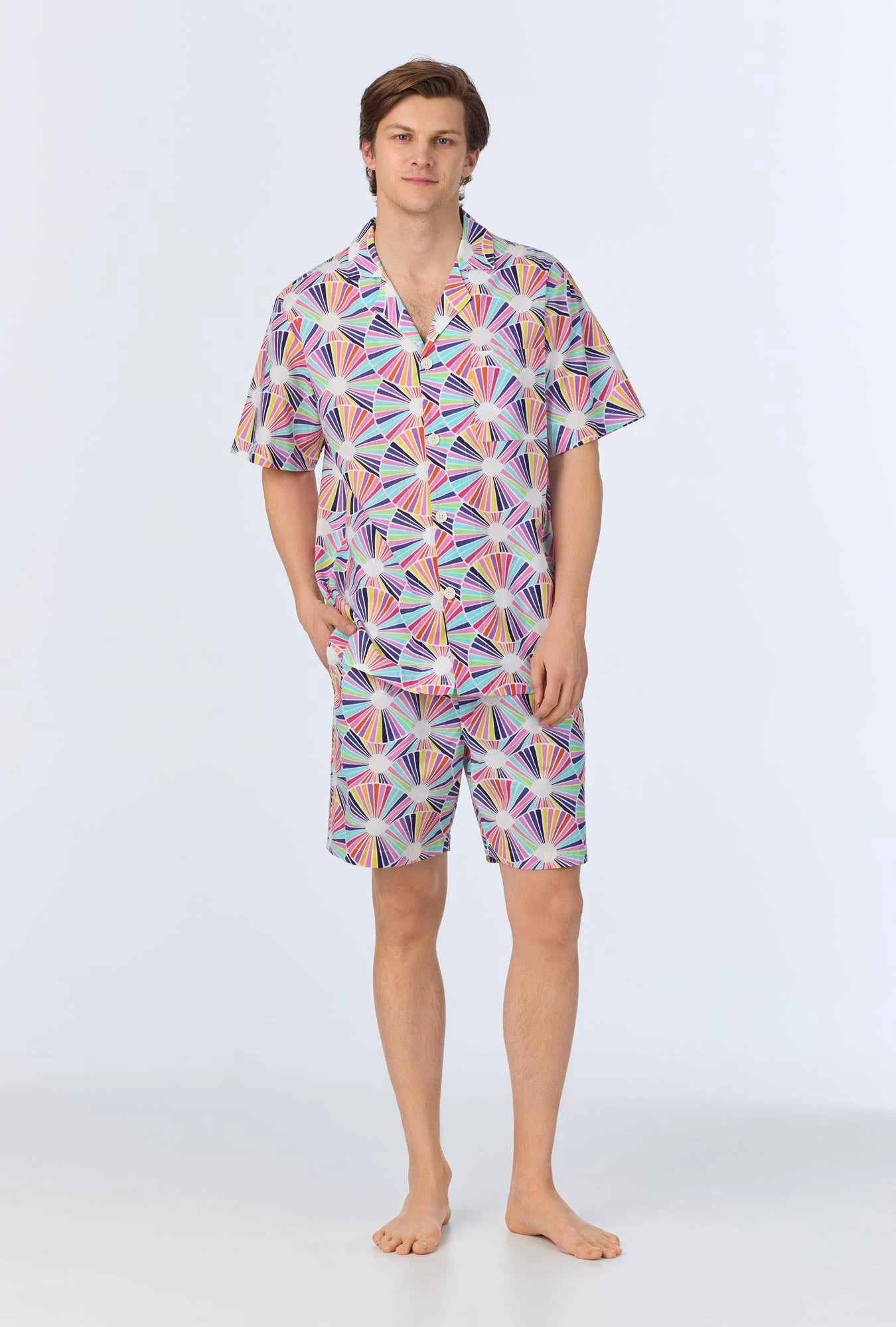 Our men’s short sleeve boxer pajama set in a multi-color modern geo print is made from organically grown woven cotton poplin for softness and breathability. The contrast summarys and chest pocket add style while the pull-on shorts have an elasticated waistband with a drawstring for a secure fit . A vibrant and stylish set for ultimate relaxation.