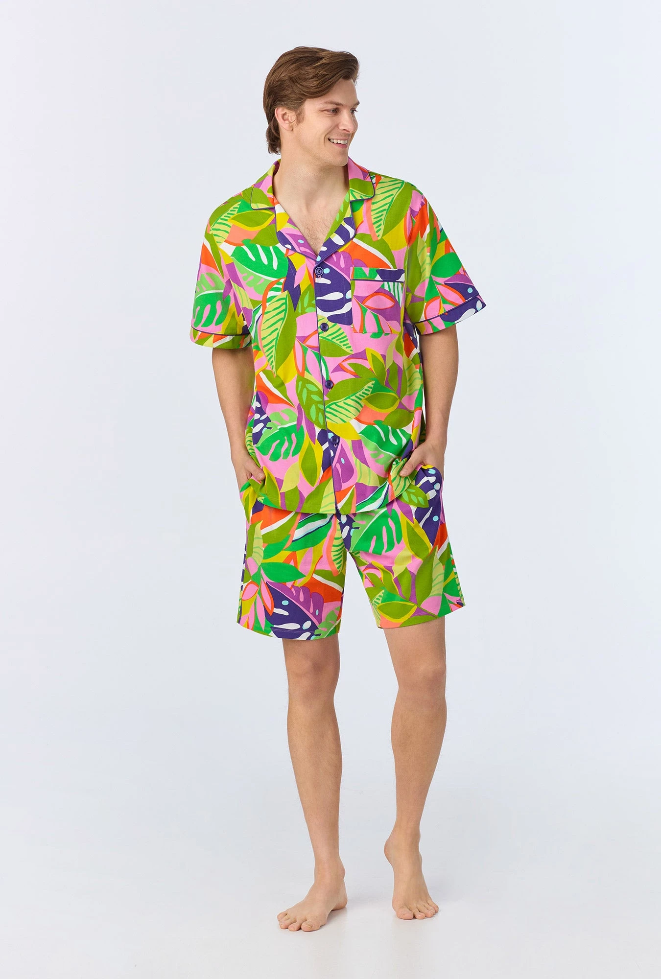 Vibrant and cozy, our mens short sleeve boxer set in a multi-color jungle leaf print, made with organically grown cotton jersey, brings a tropical vibe to your sleepwear collection. The top features contrast piping around the collar, sleeve bands, and placket. The pull-on shorts have an elasticated waistband and side pockets, perfect for lounging in style and comfort.