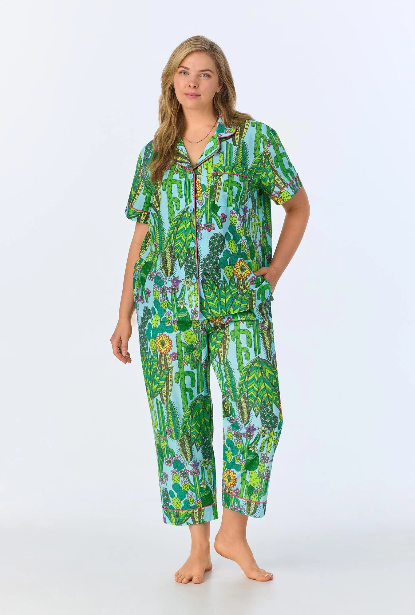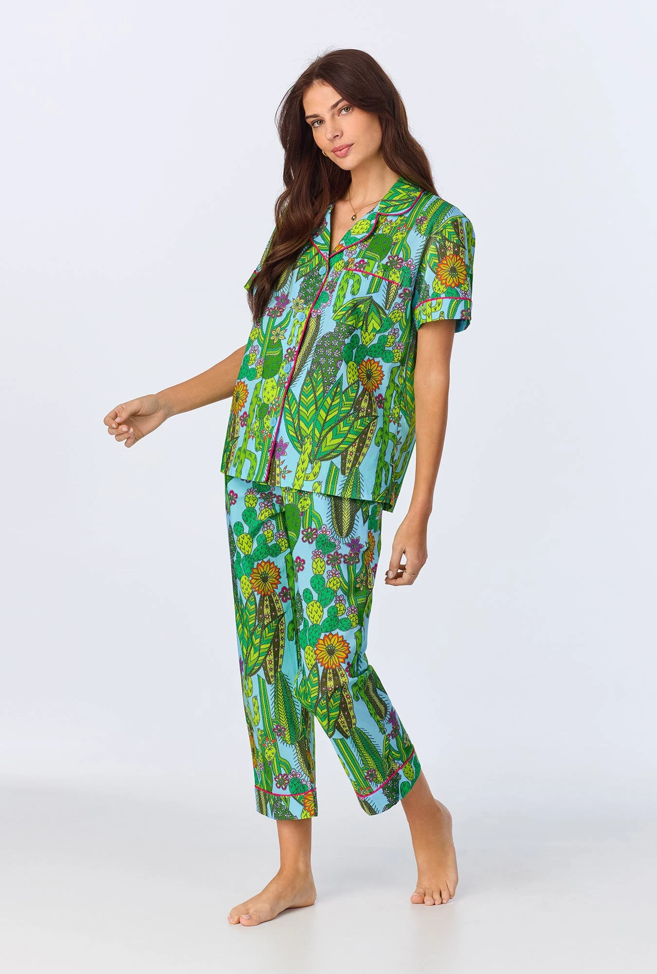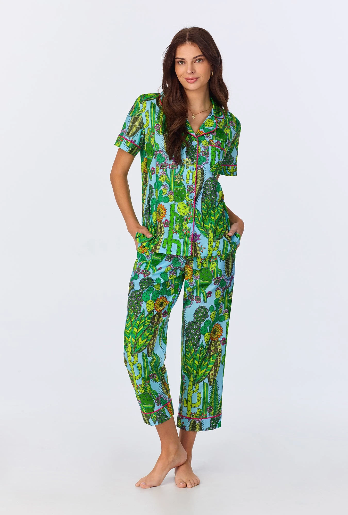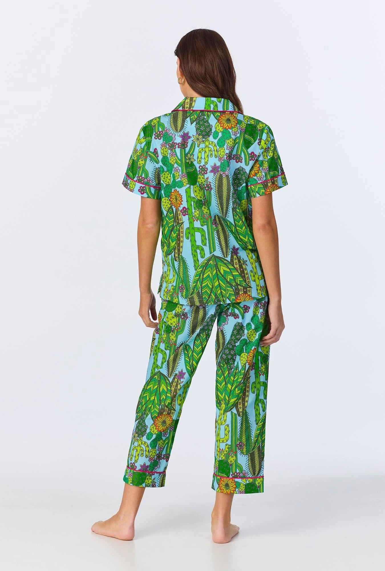 Embrace effortless style with our women’s short sleeve cropped pajama set, made from organically grown cotton poplin for exceptional comfort. The top includes contrast piping, while the pull on cropped pants feature an elasticated waistband and handy side pockets. This stylish set offers easy comfort for lounging or a cozy night in.