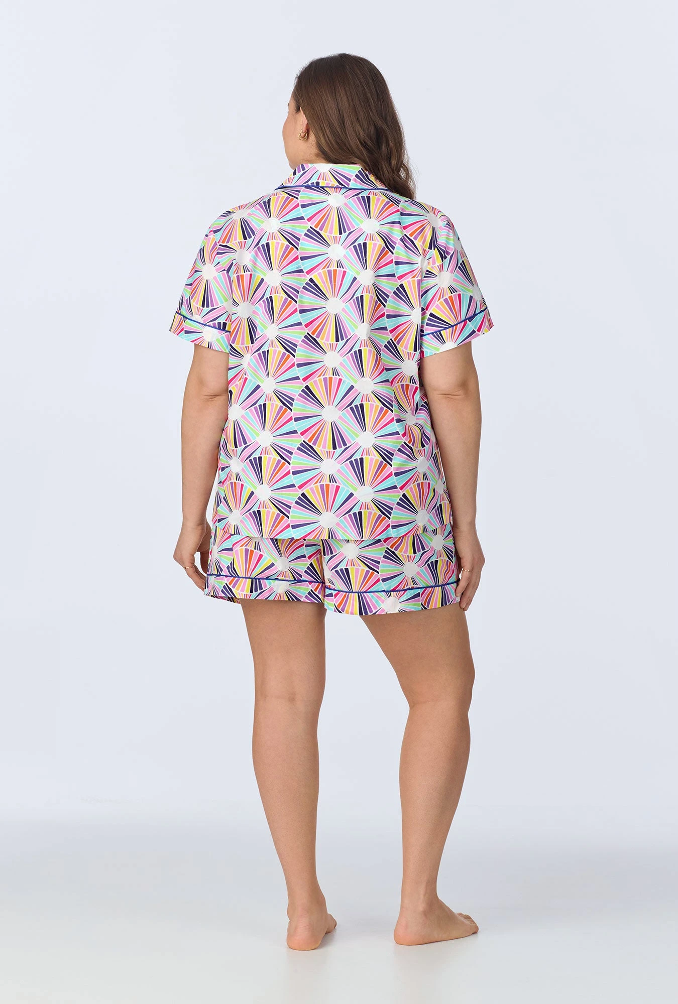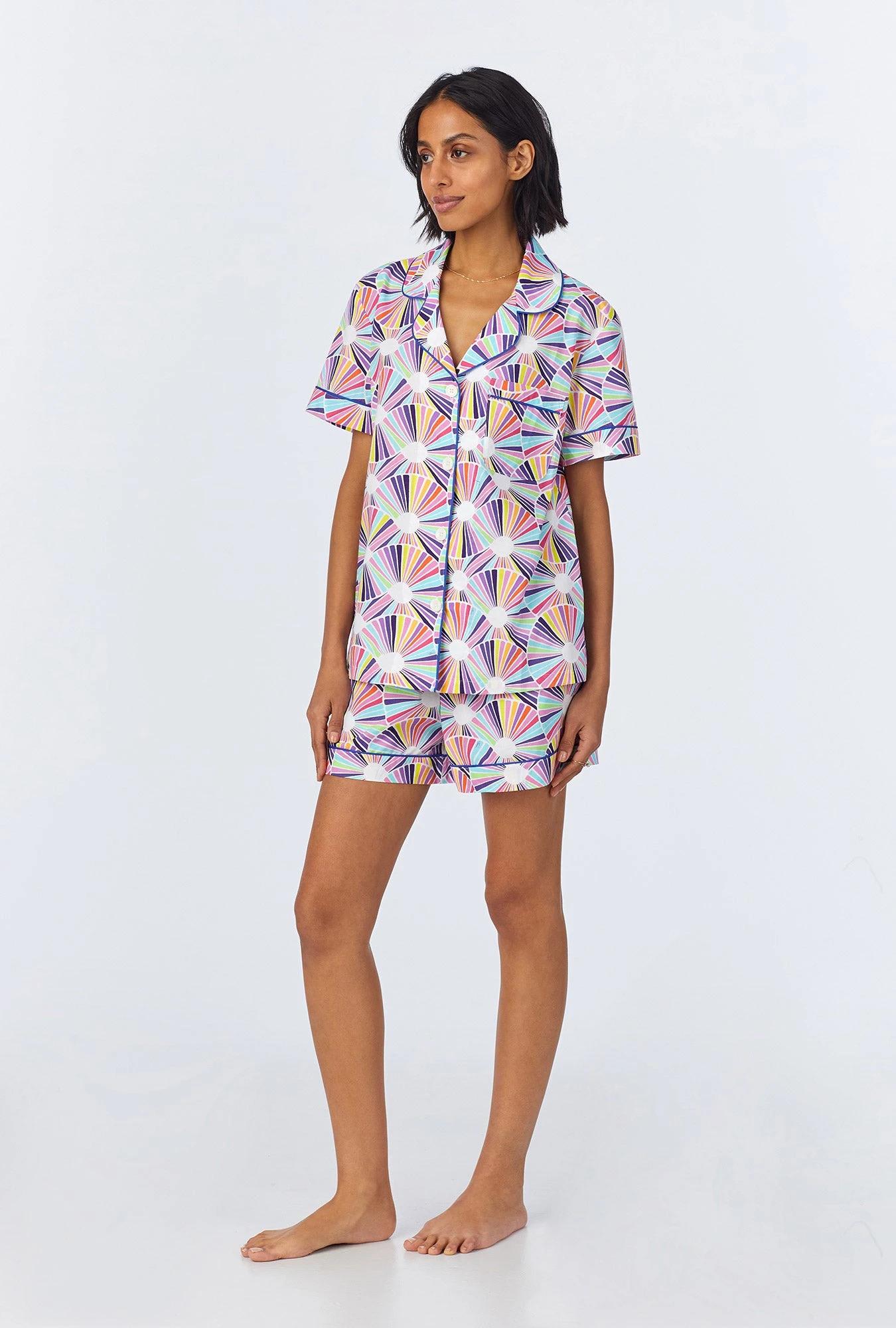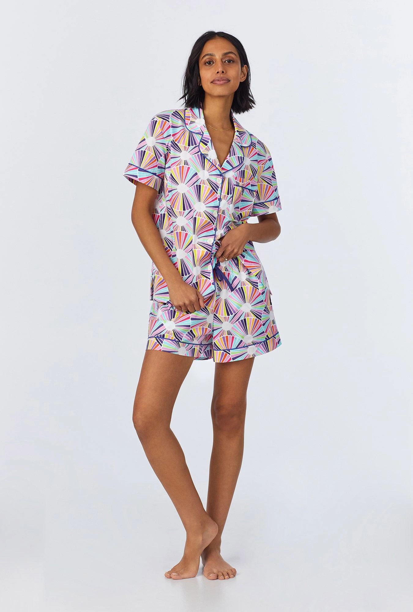 Our women’s short sleeve shorty pajama set in a multi-color modern geo print is made from organically grown woven cotton poplin for softness and breathability. The top features contrast piping on the collar, sleeve bands, and placket. The pull-on shorts have an elasticated waistband with a drawstring for a secure fit and side pockets for convenience. A vibrant yet stylish set for ultimate relaxation.