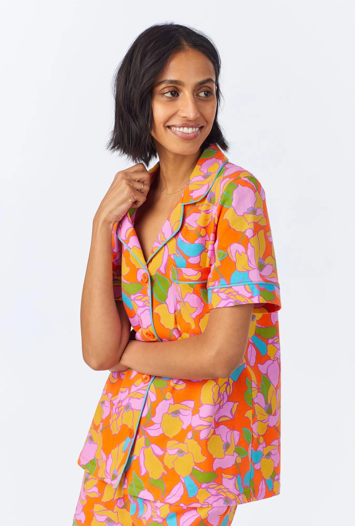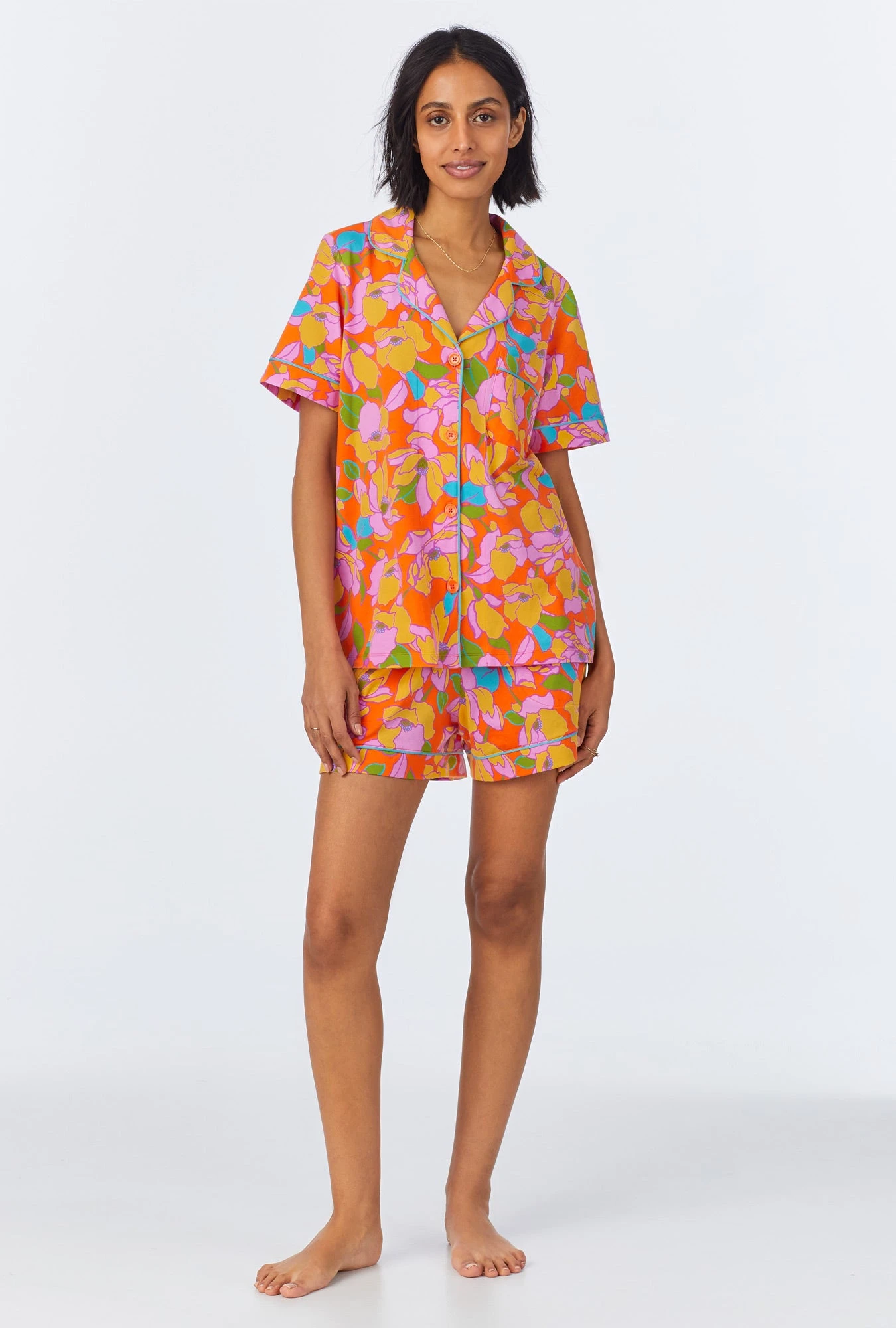 Our women’s short sleeve shorty pajama set in a multi-color floral made with organically grown cotton jersey is both chic and comfortable. The top features contrast piping around the collar, sleeve bands, and placket. The pull-on shorts have an elasticated waistband with side pockets, easy to wear and perfect for bedtime.