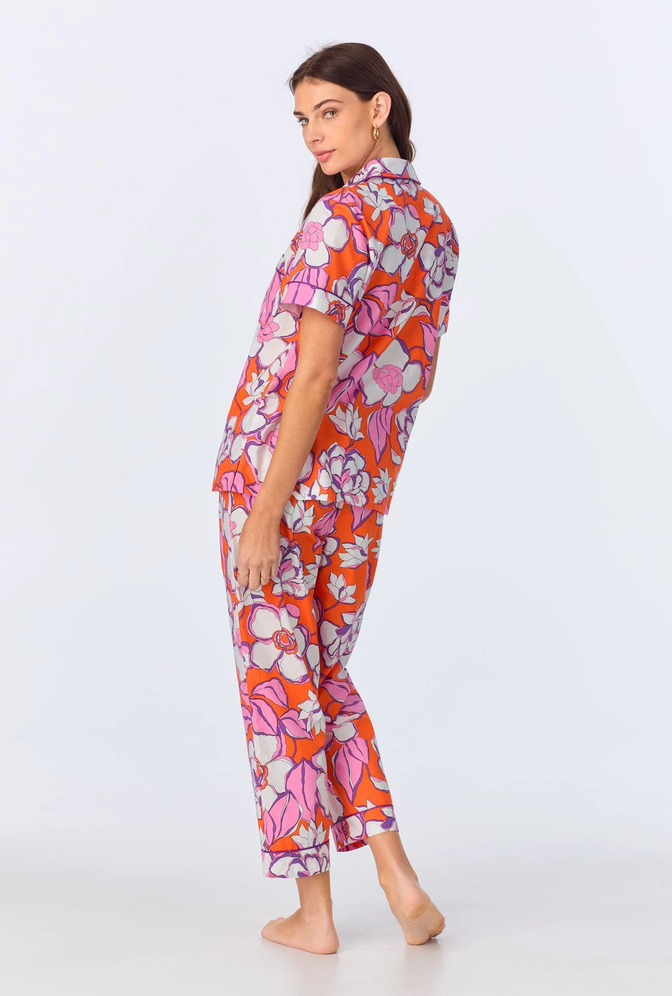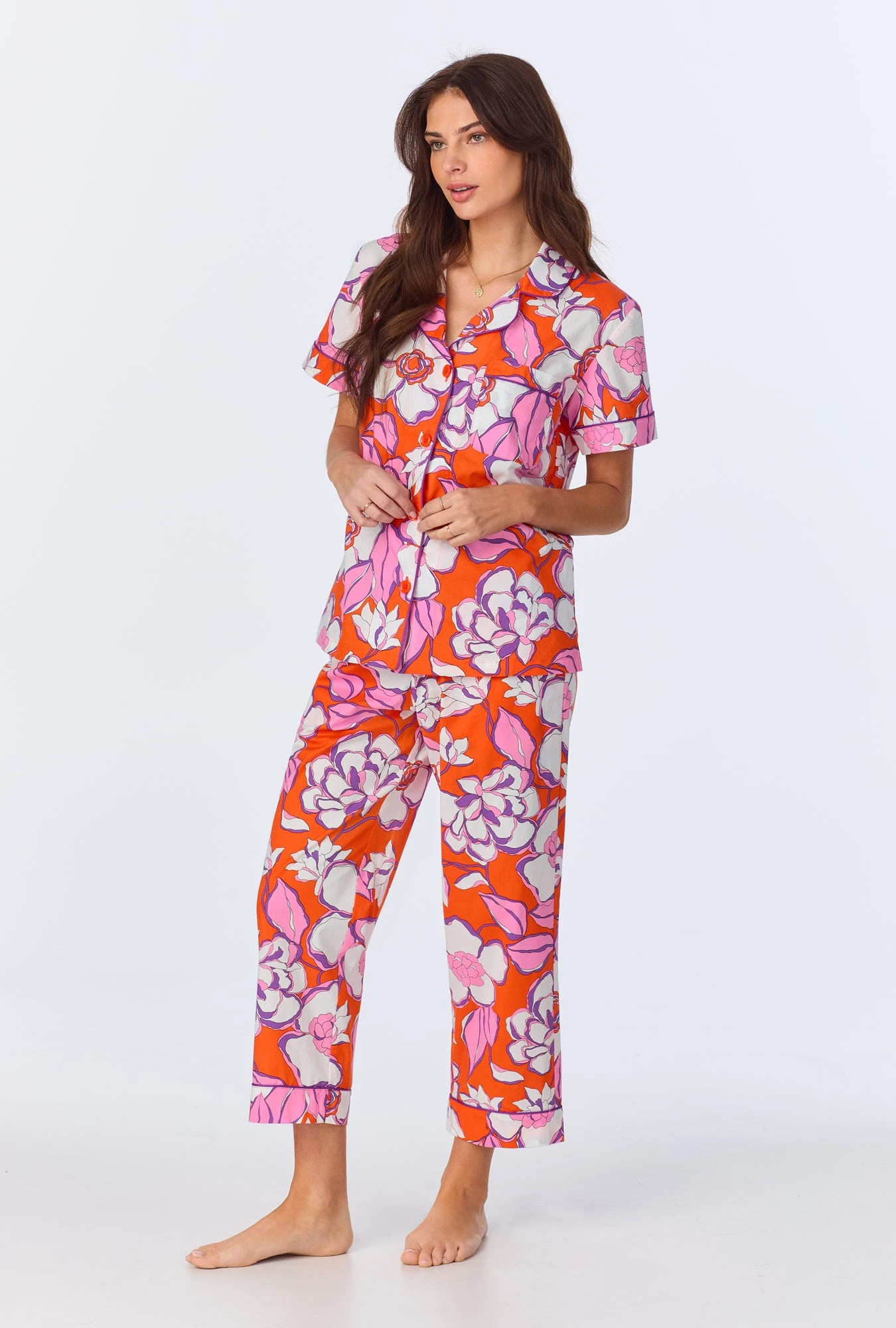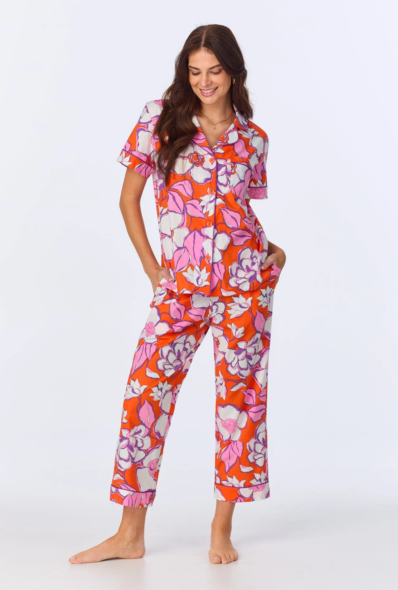 Indulge in elegance with our women’s short sleeve cropped pajama set in a multi-colored floral print, crafted from organically grown cotton poplin. The top features delicate contrast piping, while the pull-on cropped pants offer an elasticated waistband and side pockets for added comfort. This lovely set combines style and ease, perfect for a restful night in.