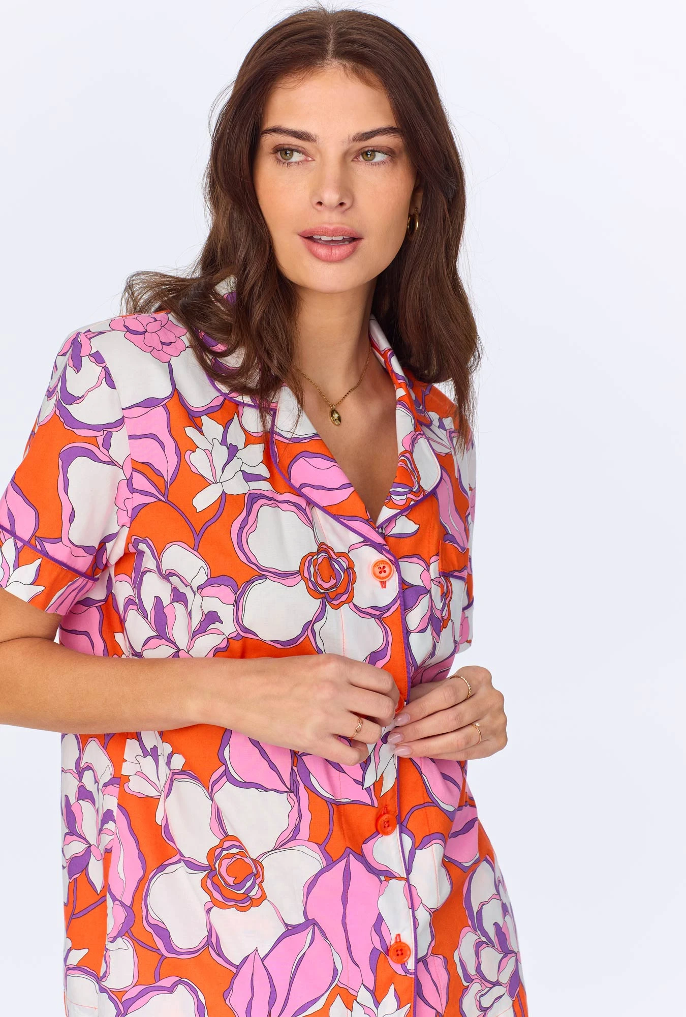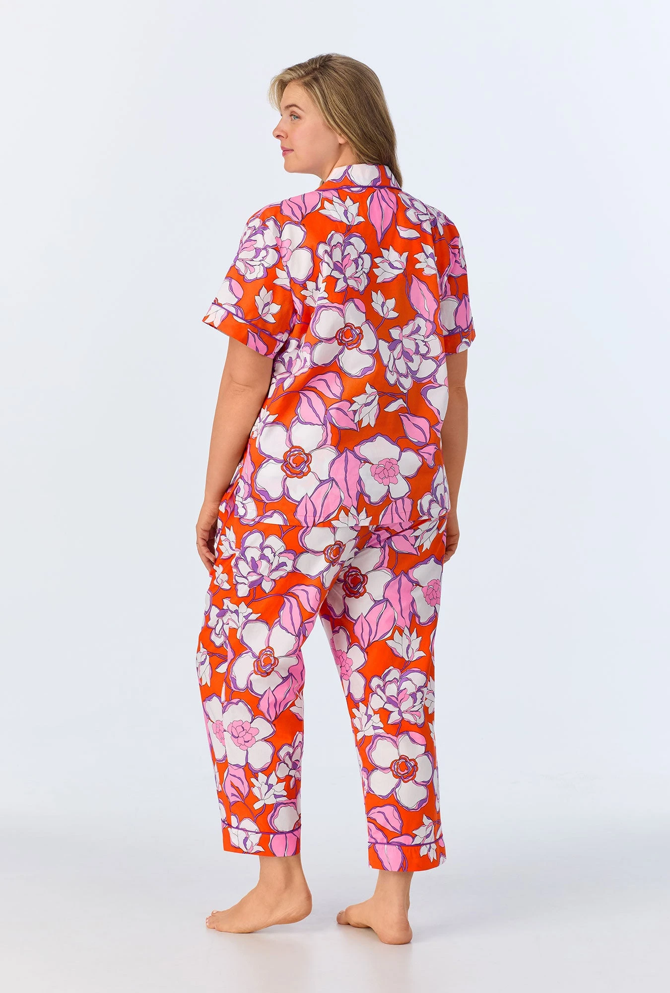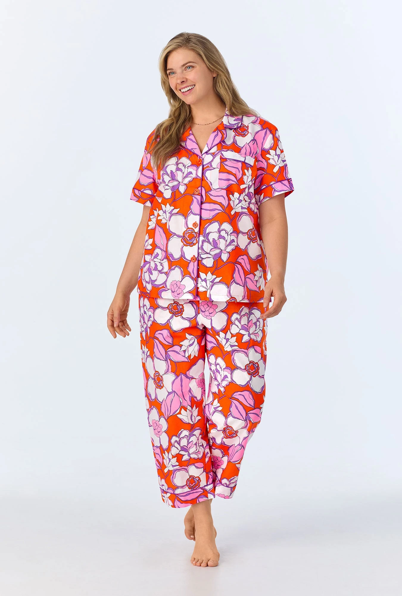 Indulge in elegance with our women’s short sleeve cropped pajama set in a multi-colored floral print, crafted from organically grown cotton poplin. The top features delicate contrast piping, while the pull-on cropped pants offer an elasticated waistband and side pockets for added comfort. This lovely set combines style and ease, perfect for a restful night in.