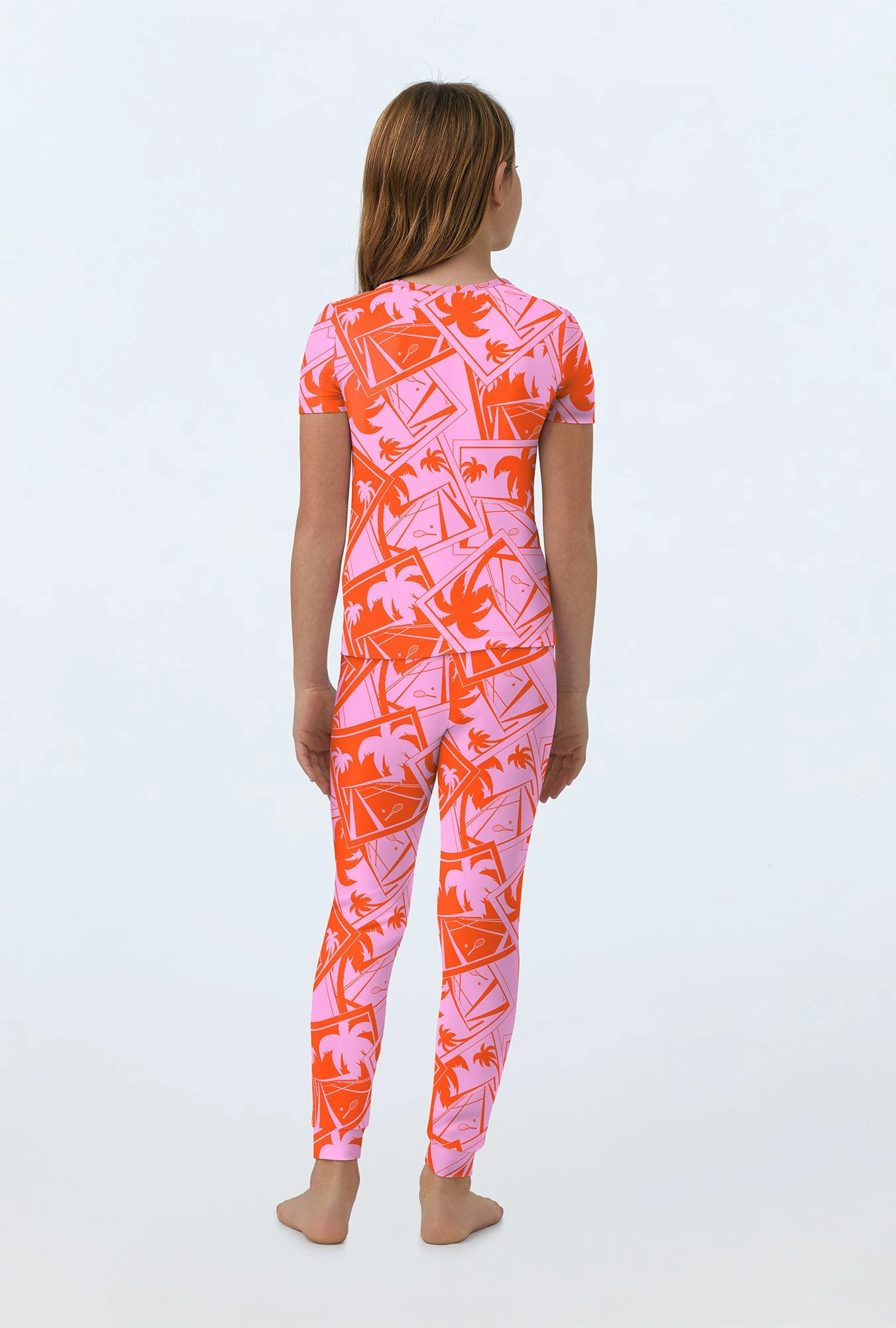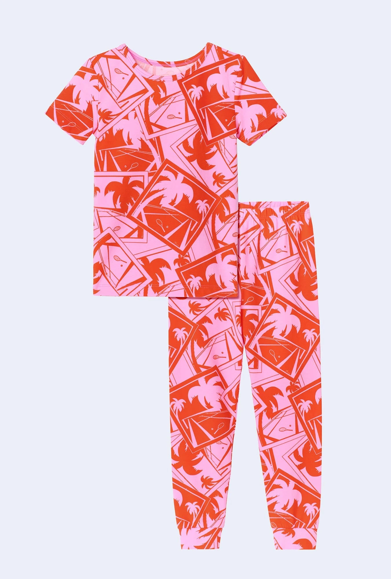 Keep little ones cozy and comfortable in our short sleeve kids pajamas made with soft organic cotton jersey in a playful pink tennis print. Pants with elastic waistband make for easy extended wear.