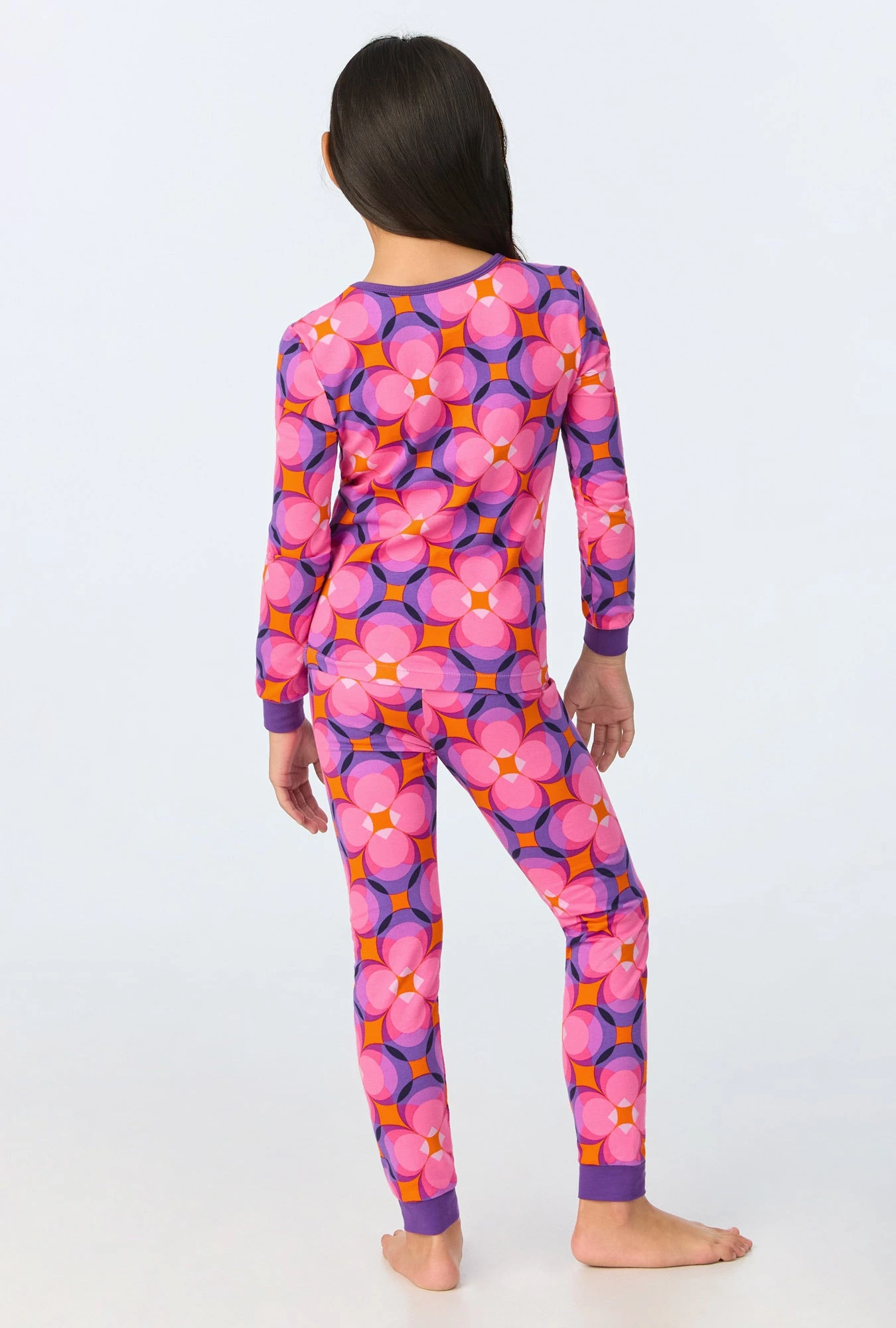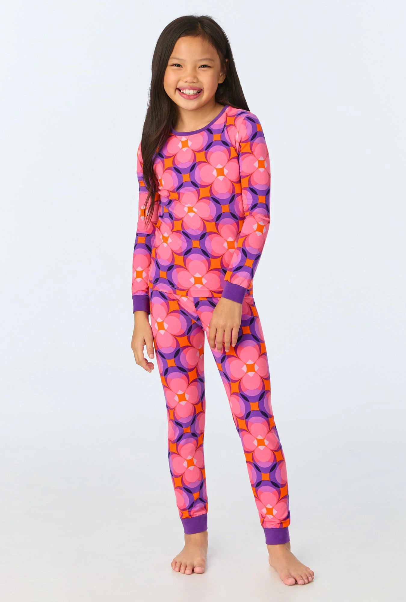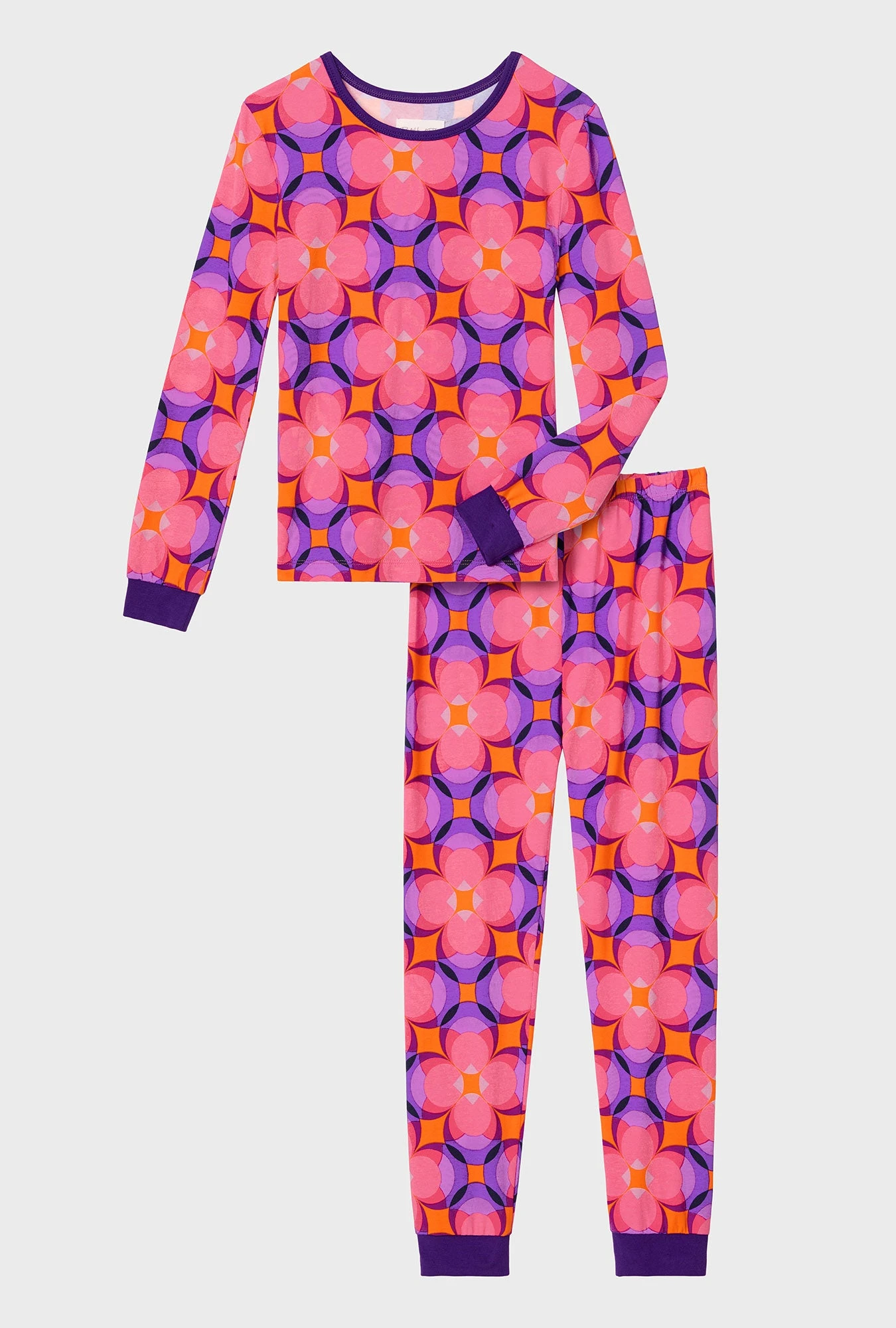 Keep your kids snug and stylish in our long sleeve stretch jersey pajama in a pretty multi color geometric print featuring a purple trim at the neckline, sleeve cuffs, and ankle cuffs. The pull-on pants with an elastic waistband ensure comfort for both sleep and play.