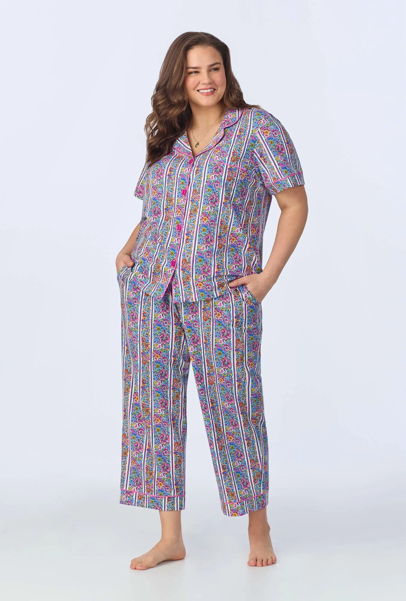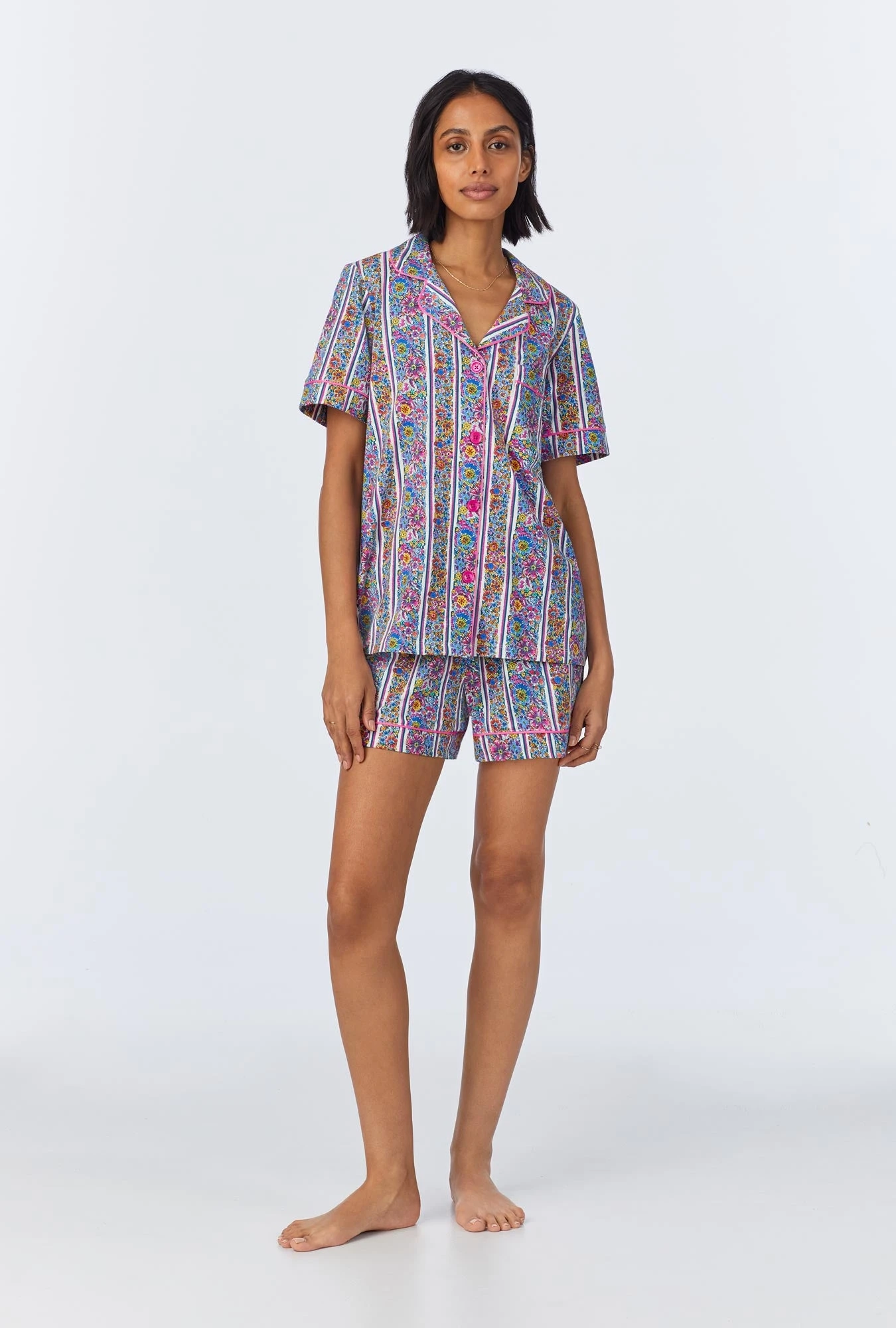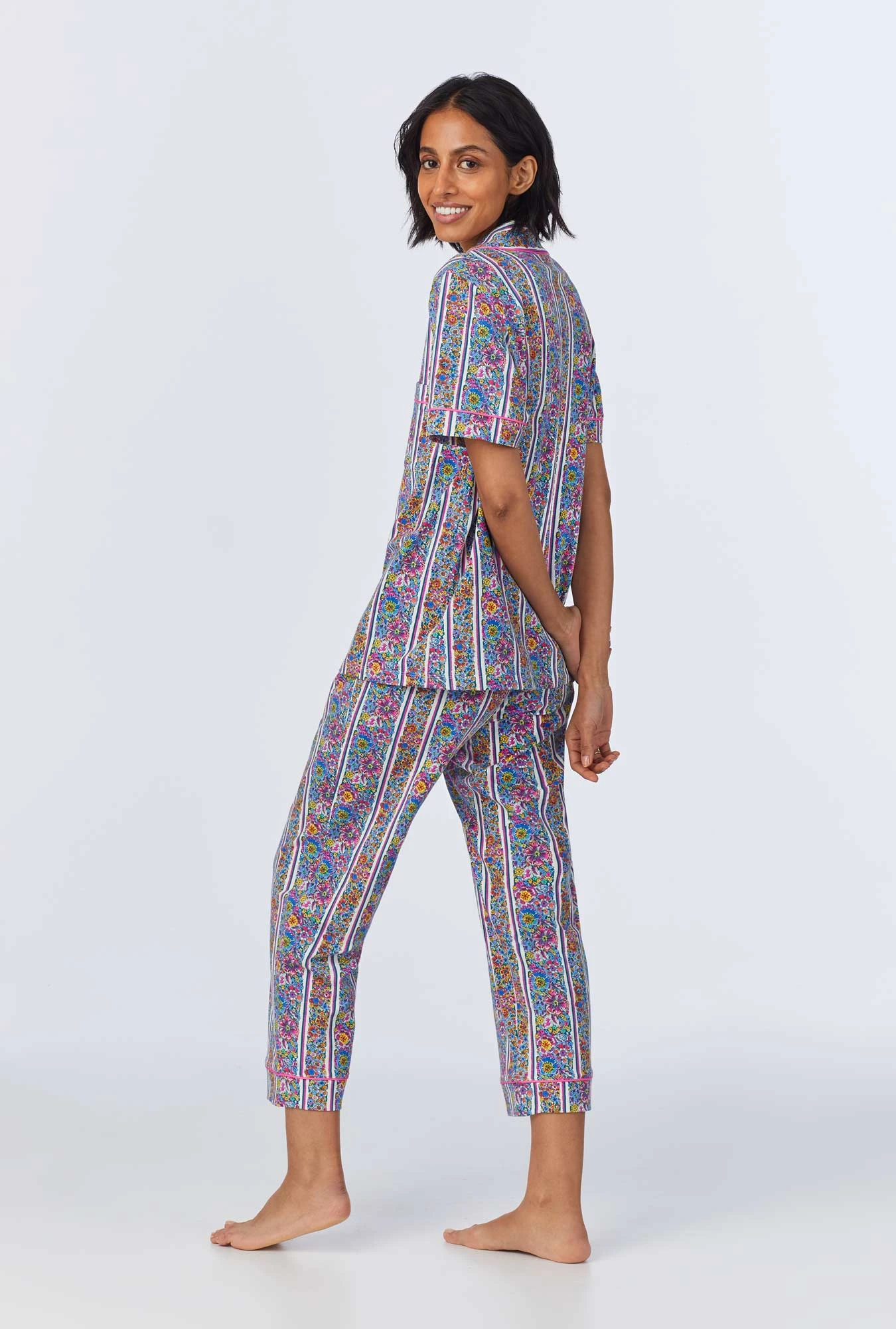Discover effortless elegance with our short sleeve cropped pajama set, featured in a multi-color stripy floral print. Crafted from organically grown cotton jersey, this set offers ultimate comfort. The top features a stylish notch collar with contrast piping, while the pants have an elastic waistband and convenient side pockets.