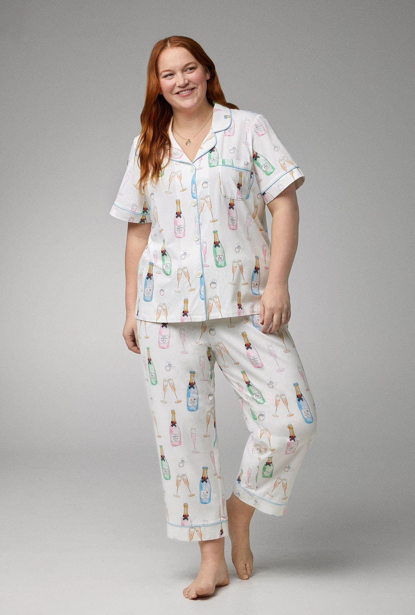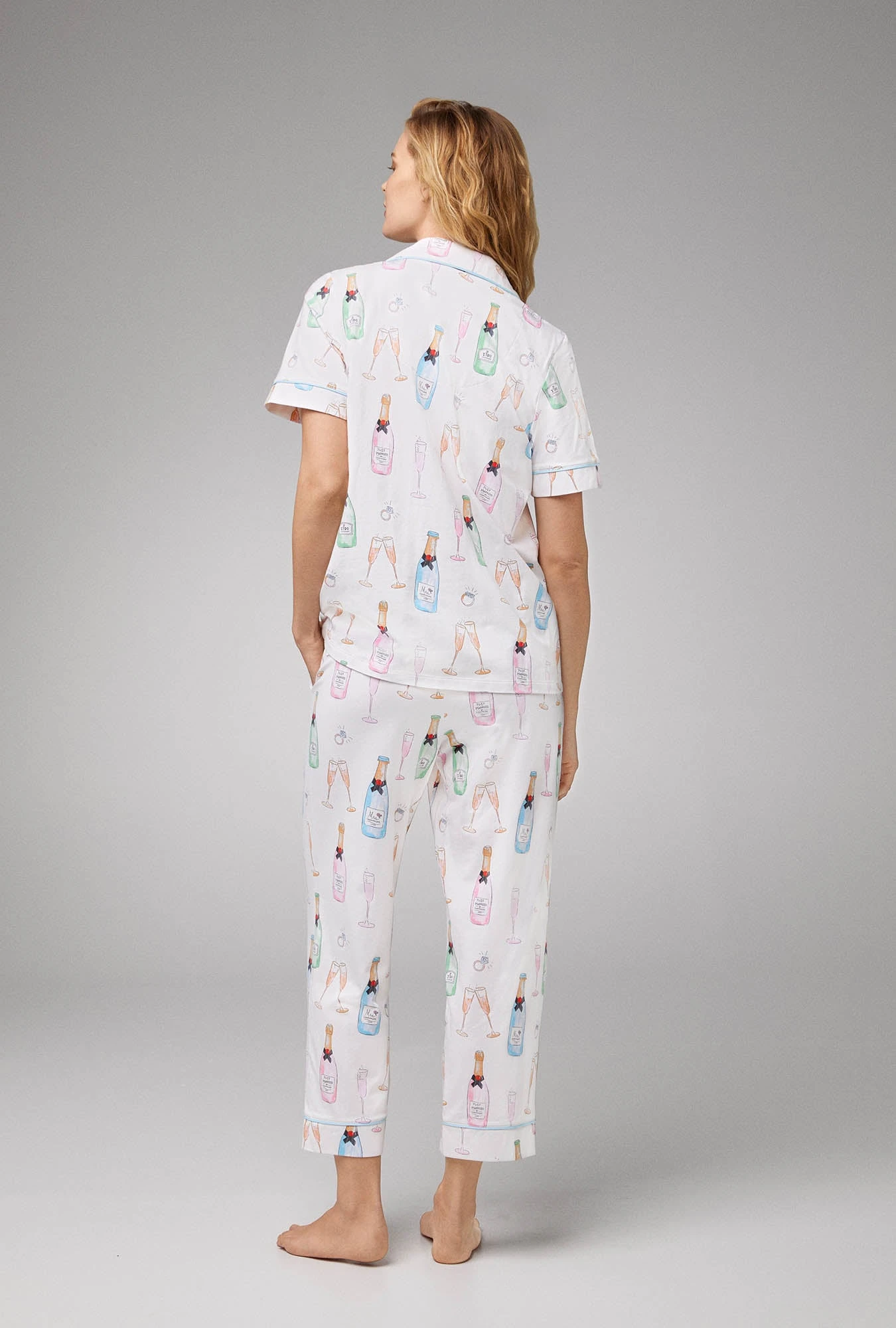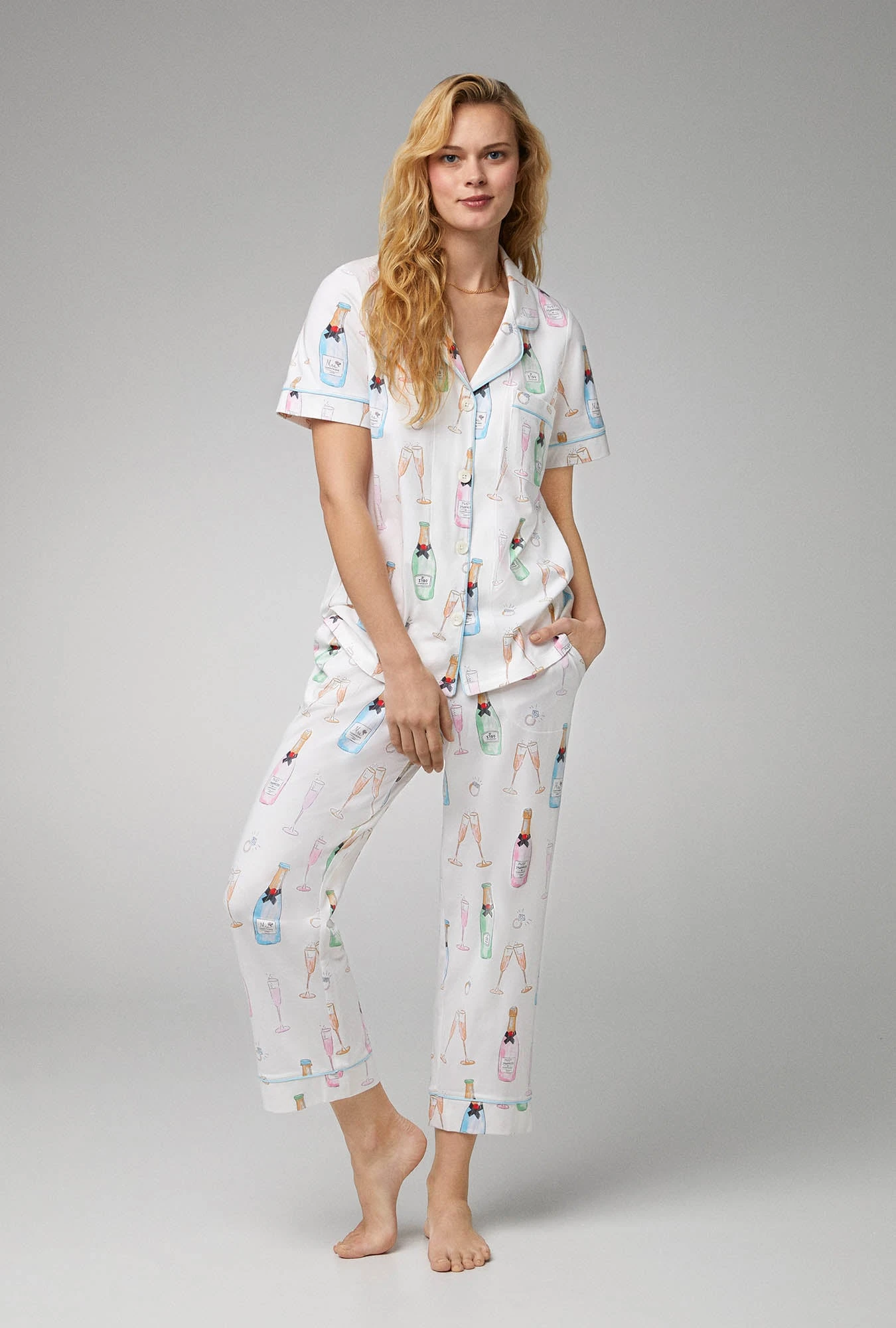 Celebrate in stylish comfort with our short sleeve jersey cropped pajamas in a festive Champagne print. Contrast knit piping at the collar and cuffs, a chest pocket, and notch collar elevate the look; and cropped pants with pockets and an elastic waistband are perfect for relaxing in or out of bed.