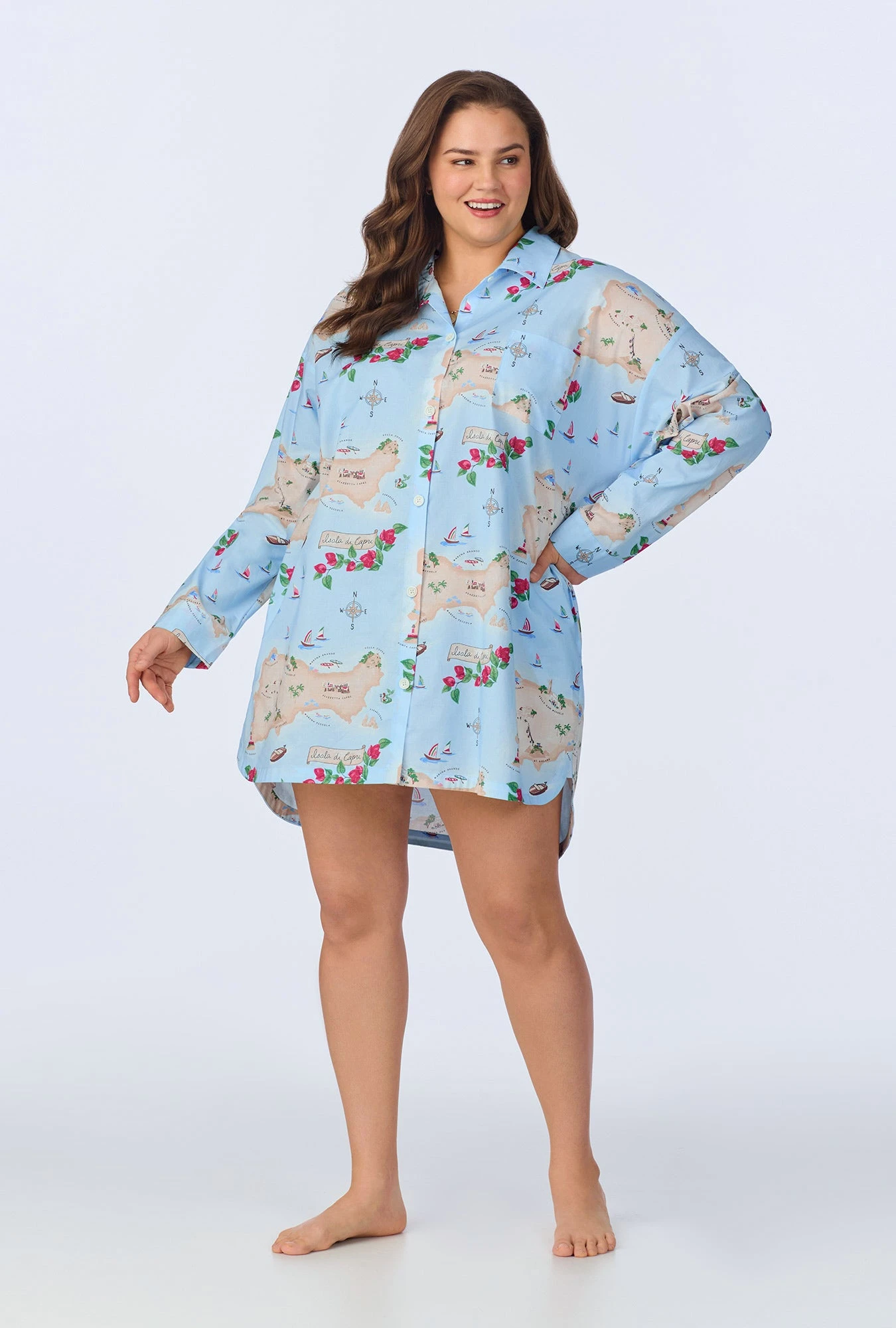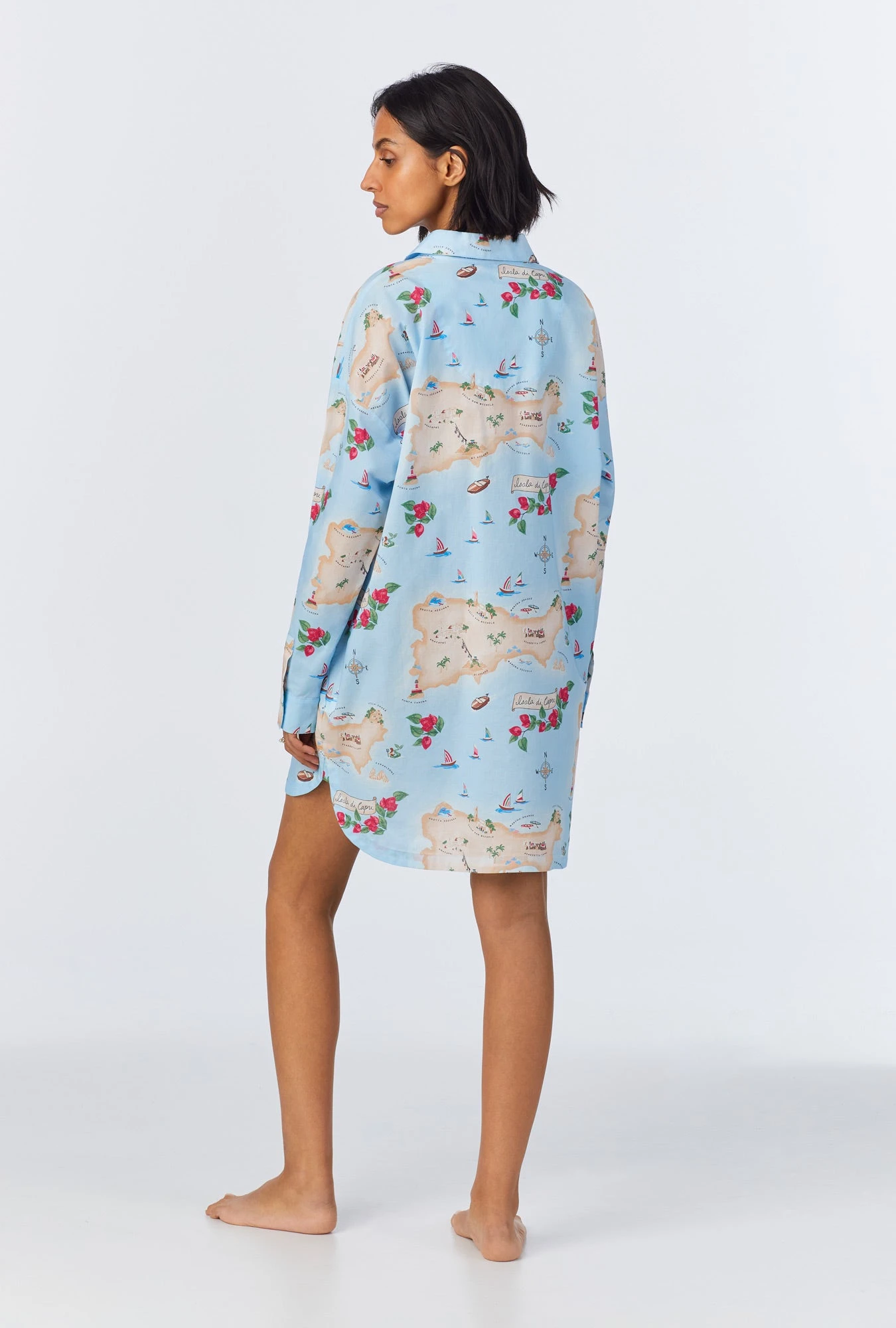 Our long sleeve sleepshirt in a Capri inspired print is made with organically grown woven cotton poplin. It features a chest pocket and side slits for added style and comfort. A perfect blend of laid-back elegance and ease, this sleepshirt is ideal for cozy nights and relaxing mornings.