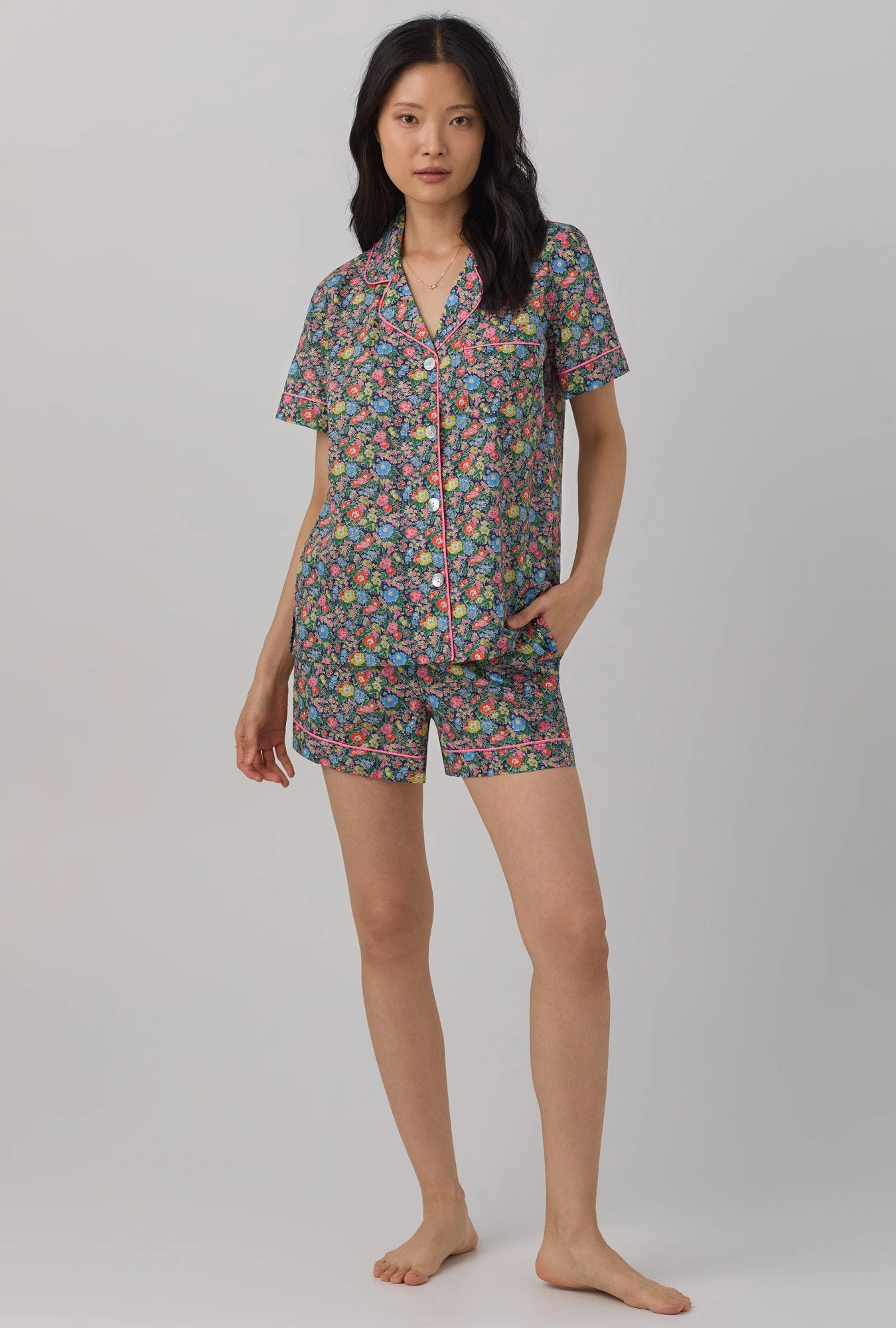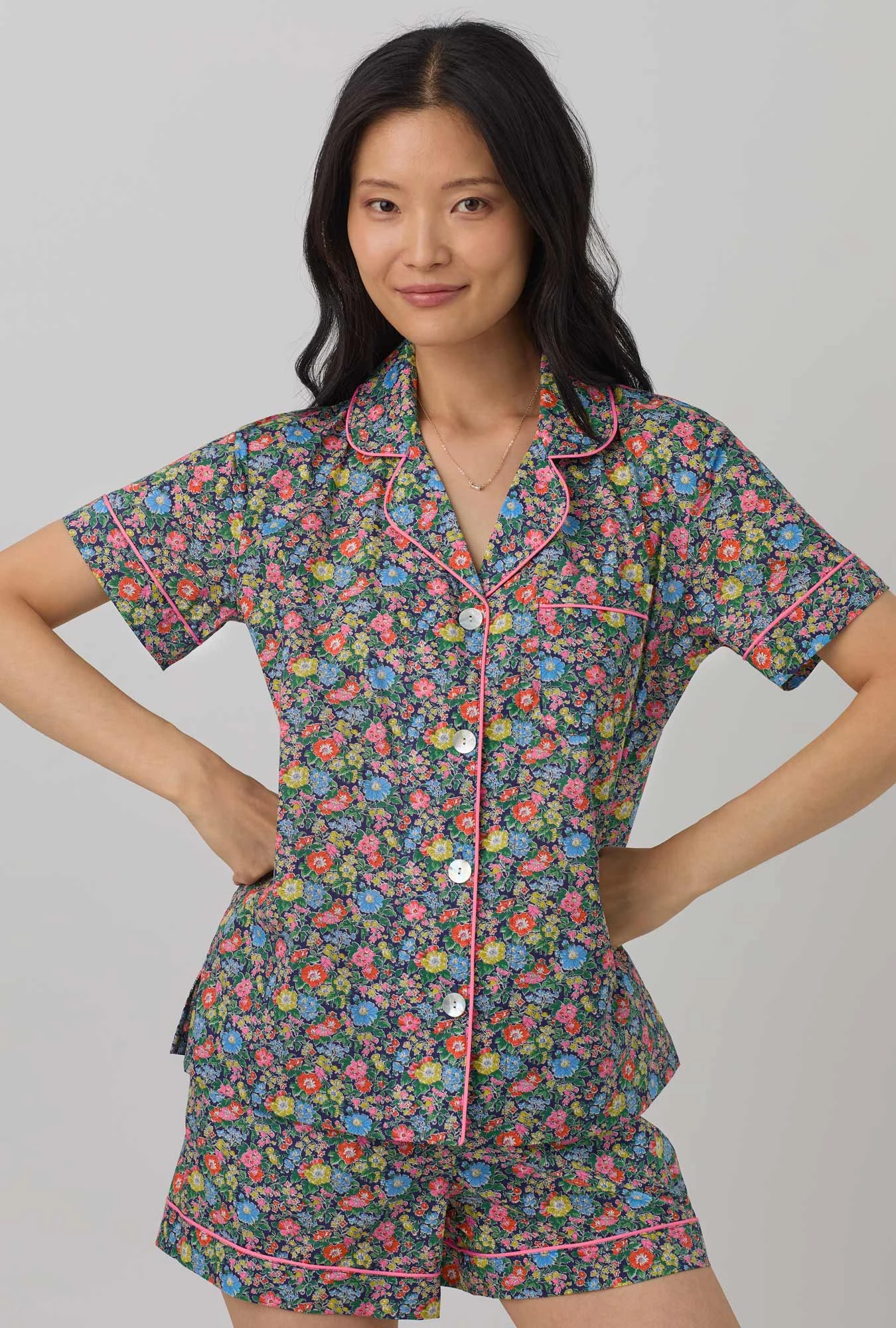 Our women’s 100% cotton Tana Lawn® Liberty Fabrics short sleeve shorty pajamas in a pretty multy color floral print are cozy and comfortable. Contrast pink trim at collar and cuffs, a notch collar, and chest pocket tailor the look; and pull-on shorts with a self fabric drawcord waistband and pockets make for easy extended wear.