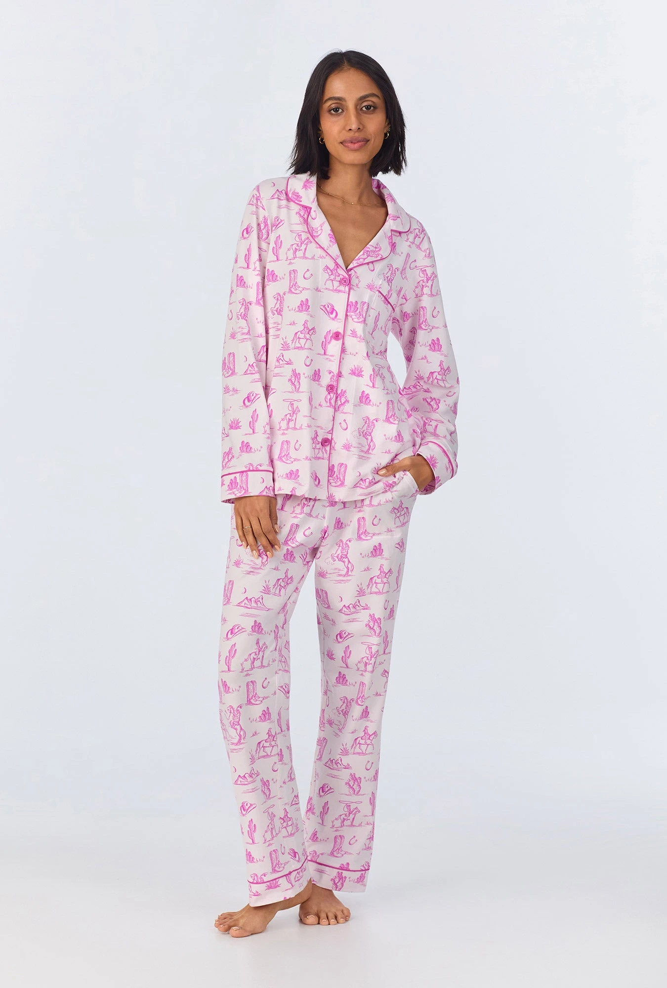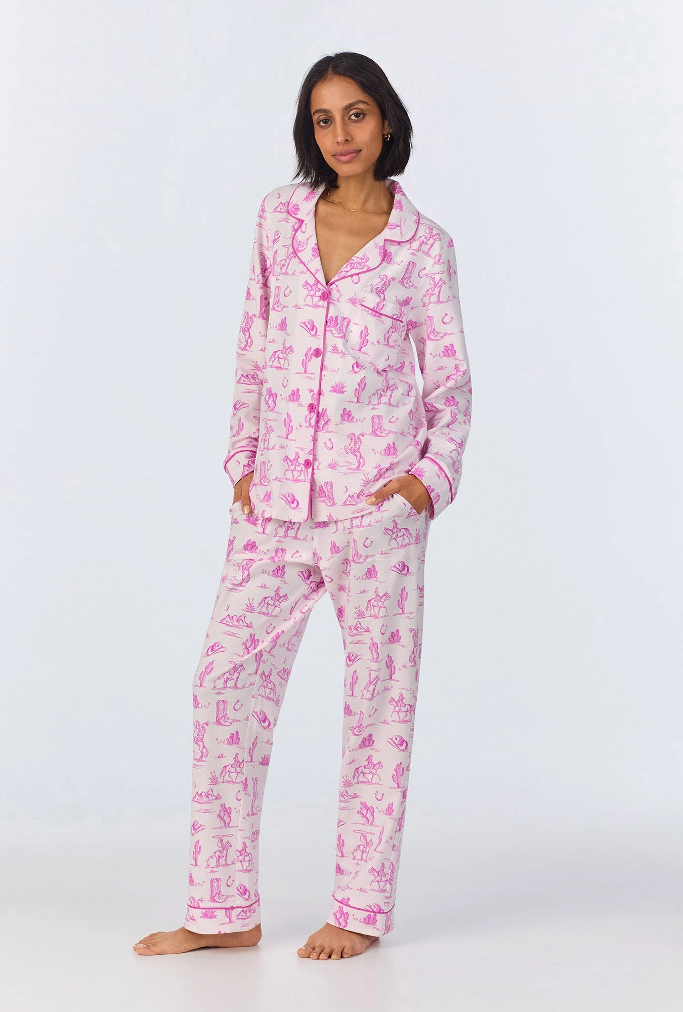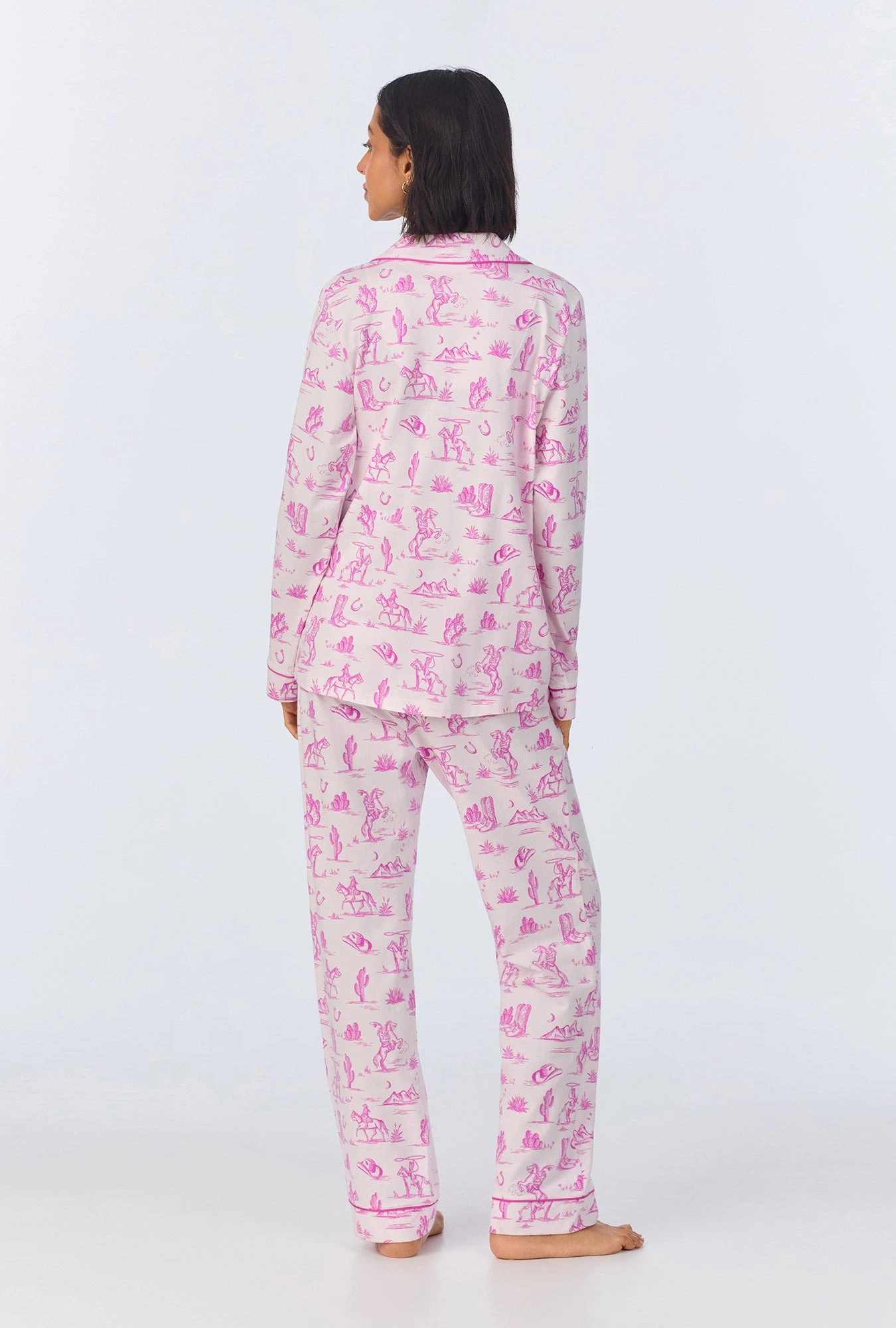 Pretty and chic, our women’s long sleeve pajama set in a pink cowgirl print is made with organically grown cotton jersey for ultimate comfort. The top features contrast piping around the collar, sleeves, and placket. The pull-on pant have an elastic waistband with side pockets for a relaxed fit. This easy-to-wear set offers effortless style and comfort for your night routine.