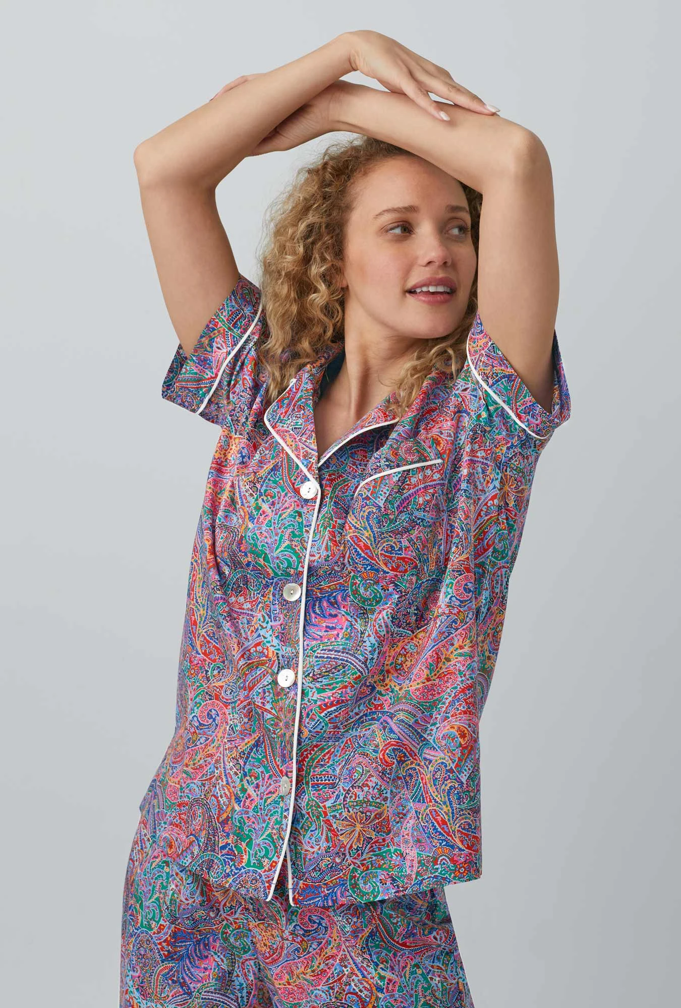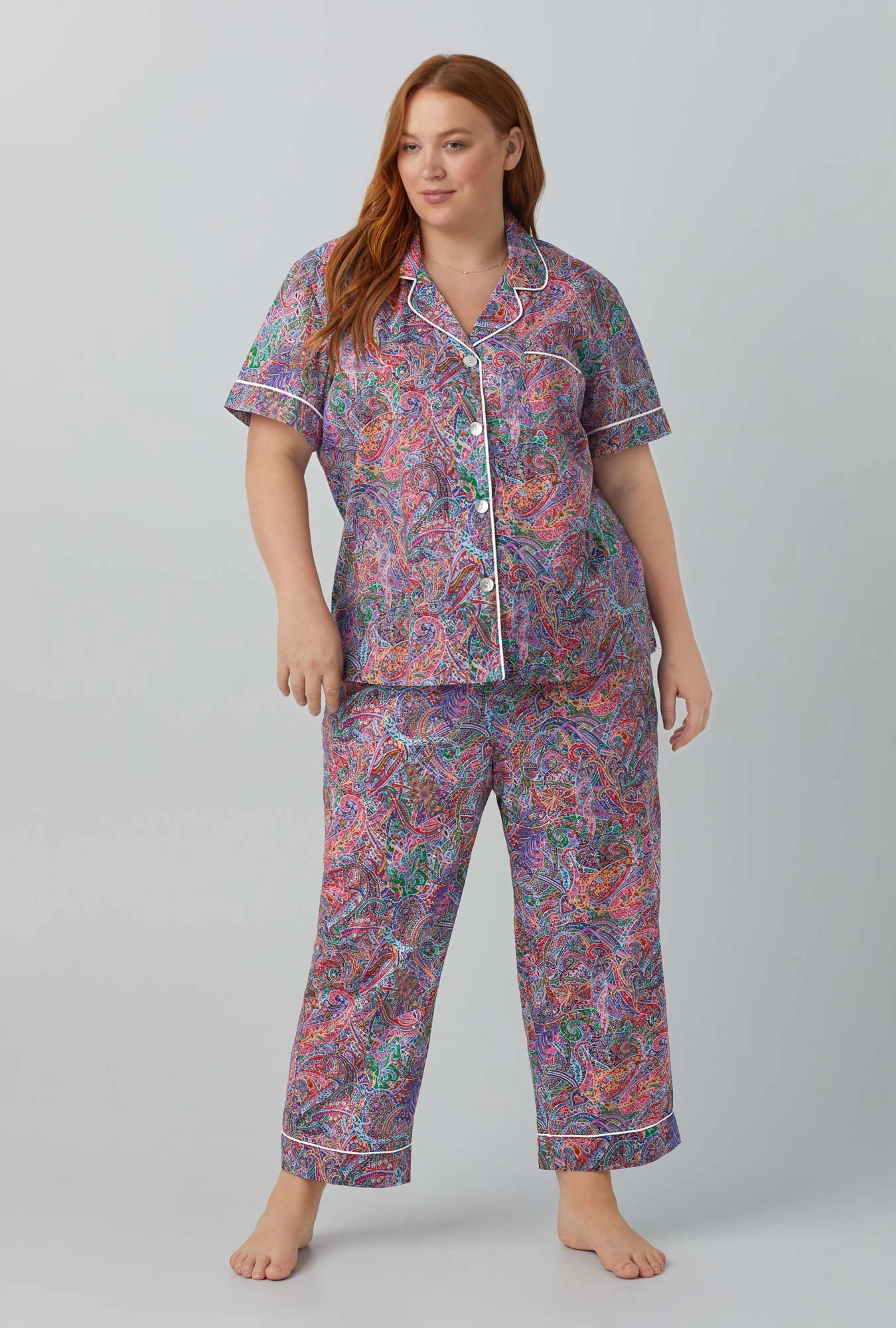 Our short sleeve 100% cotton pajamas made with Liberty Fabrics in a pretty paisley print combine comfort and elegance. Tailored with white contrast knit piping, a notch collar, and chest pocket. Pull-on cropped pants with pockets, an elastic waistband, and drawstring are ideal for lounging in bed or around the house.