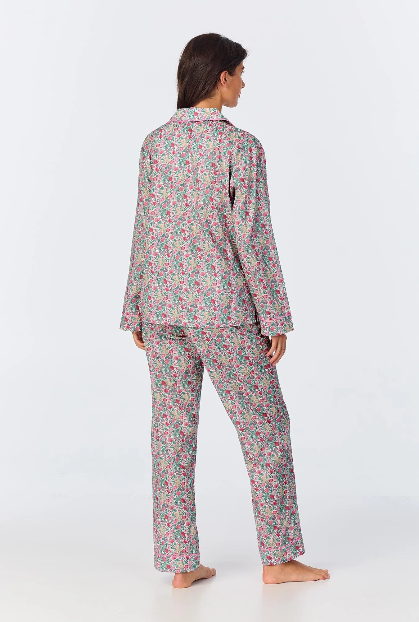 Our long sleeve cotton pajamas made with Liberty Fabrics in a dainty pink floral print combine comfort and elegance. Tailored with pink contrast knit piping, a notch collar, and chest pocket. Pull-on pants with pockets, an elastic waistband, and drawstring are ideal for lounging in bed or around the house.