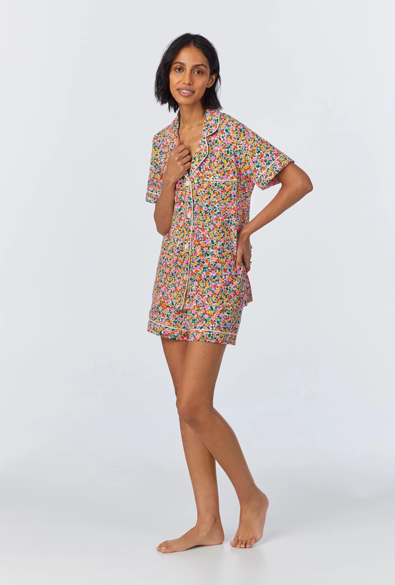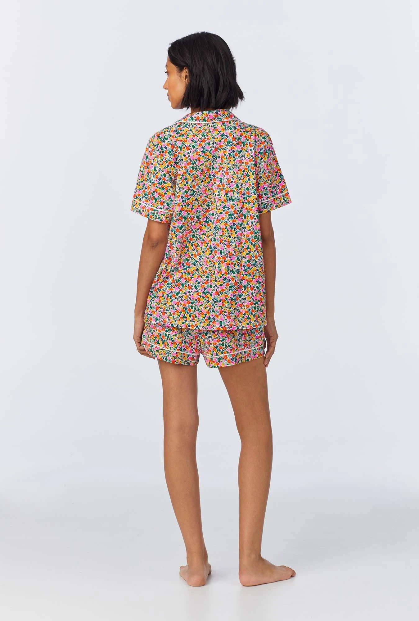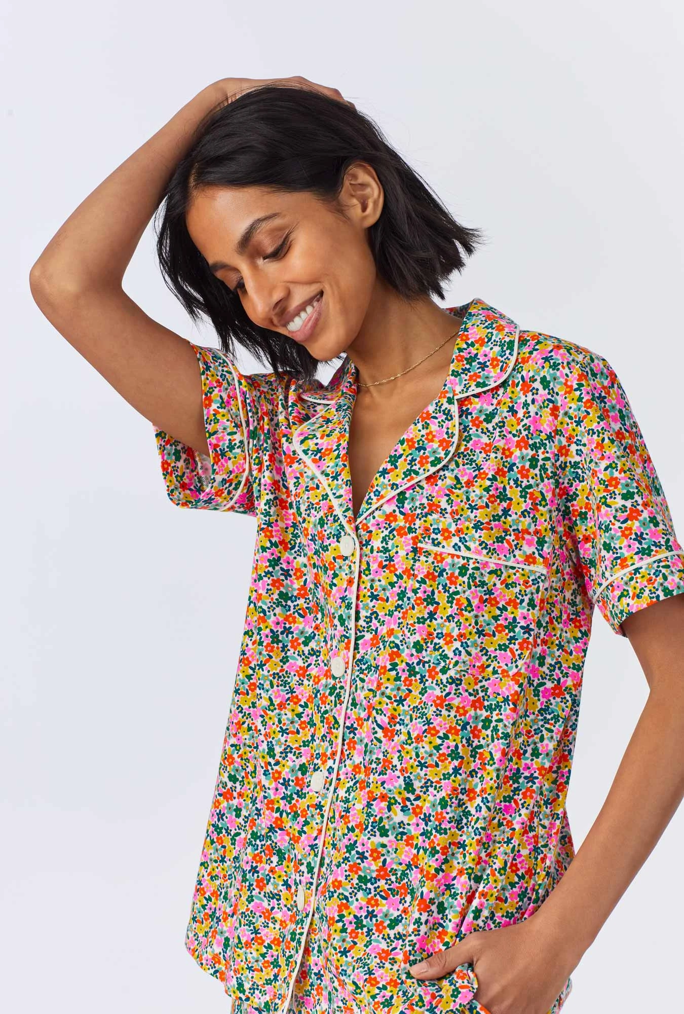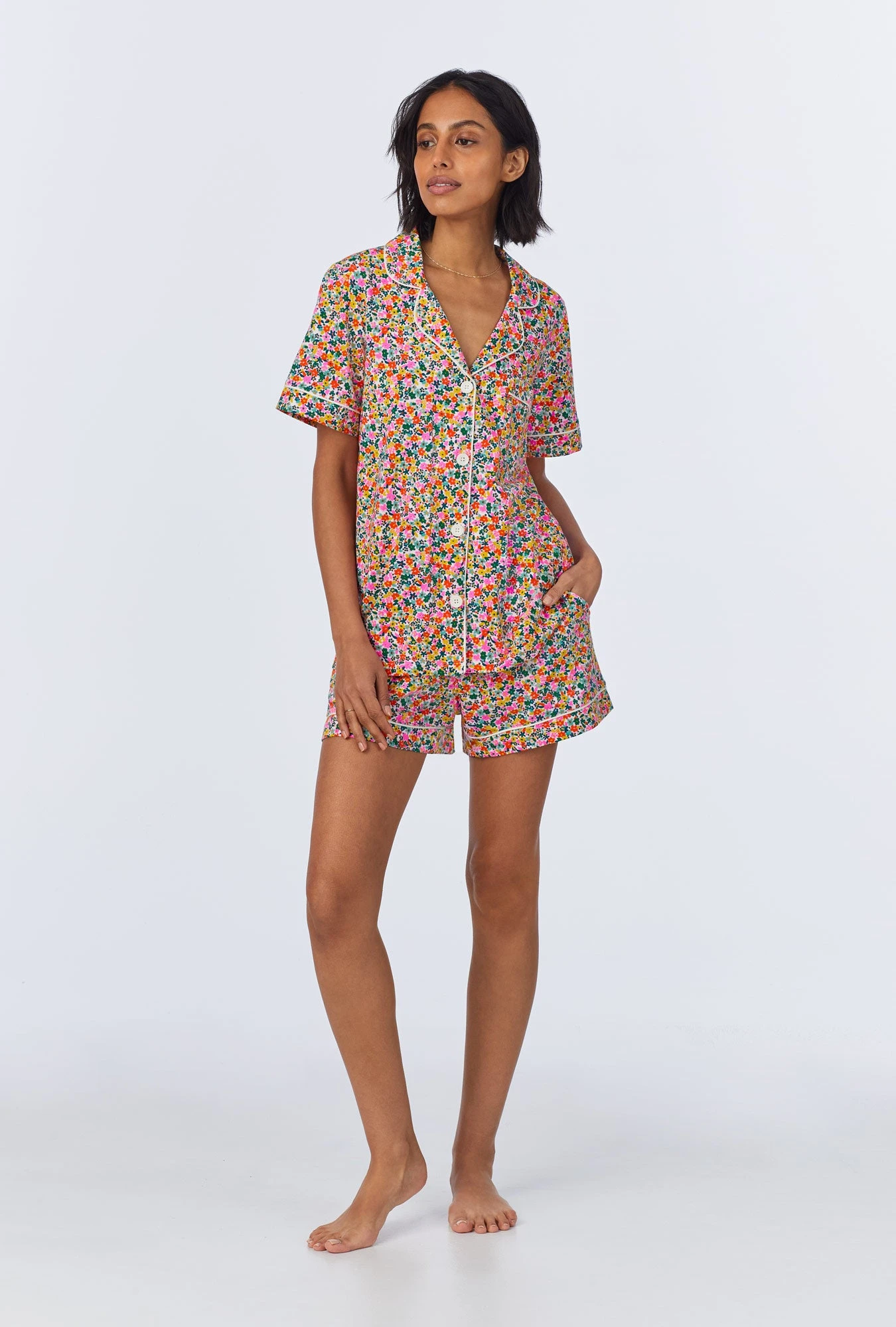 Delicate and feminine, our short sleeve shorty pajama set features a multi-color floral print crafted from organically grown cotton jersey. The top has sweet contrast piping on the collar, sleeves, and placket. The comfy pull-on shorts offer an elastic waistband and side pockets for convenience. Effortlessly stylish and easy to wear, this set is perfect for cozy nights in.
