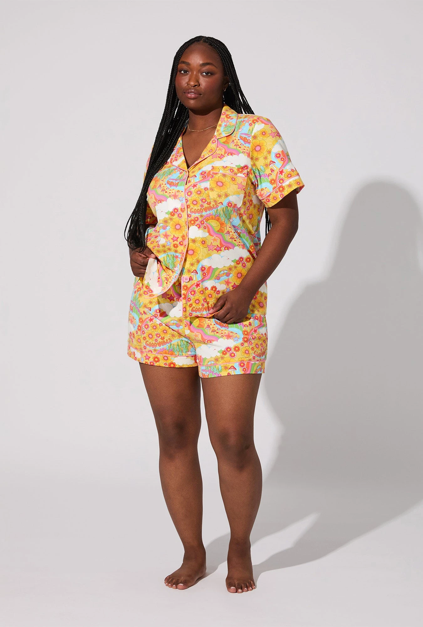 This shorty set is pure sunshine with playful shorts and a relaxed short sleeve top. Covered in happy florals and swirling colors, it’s made for warm nights and groovy dreams.