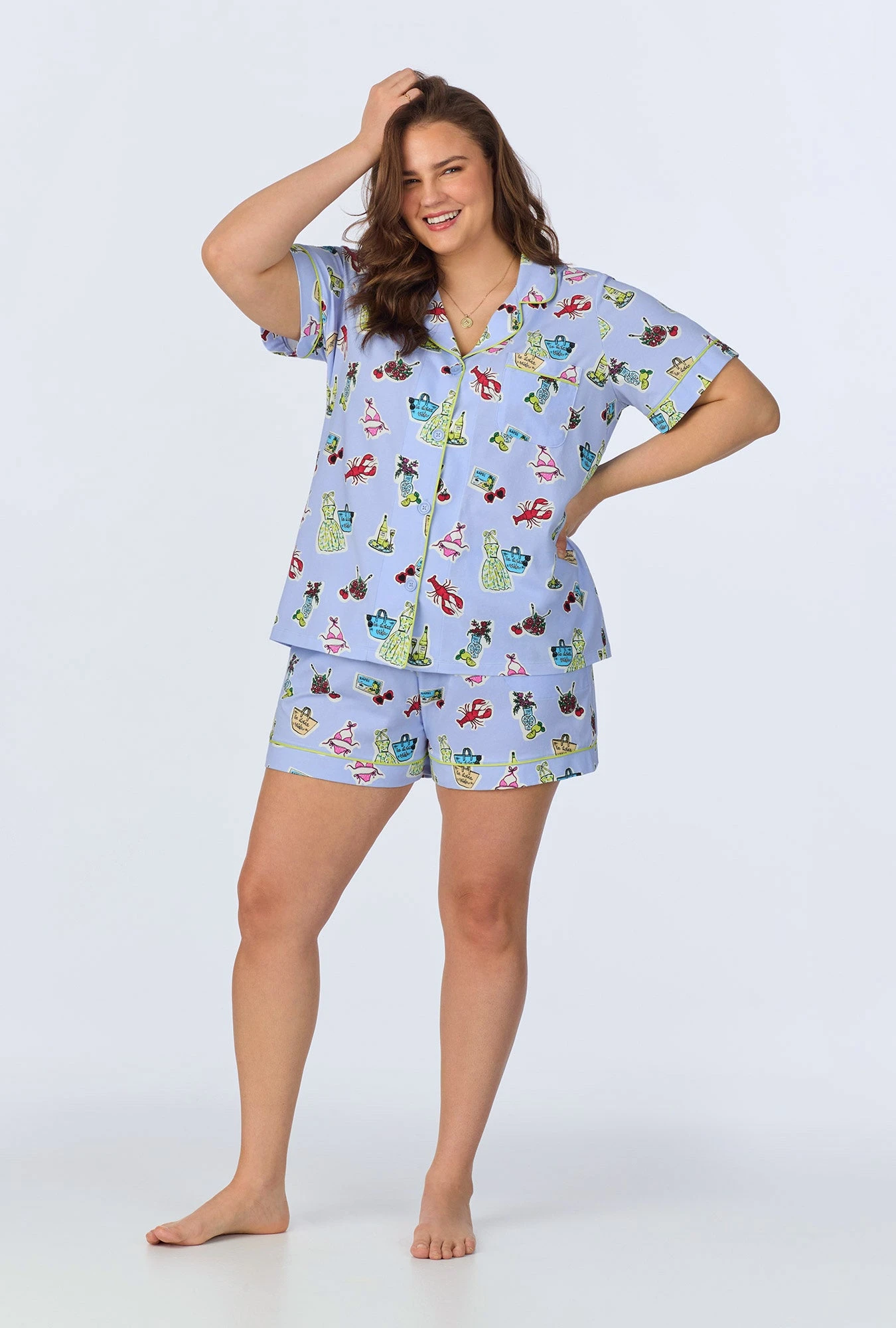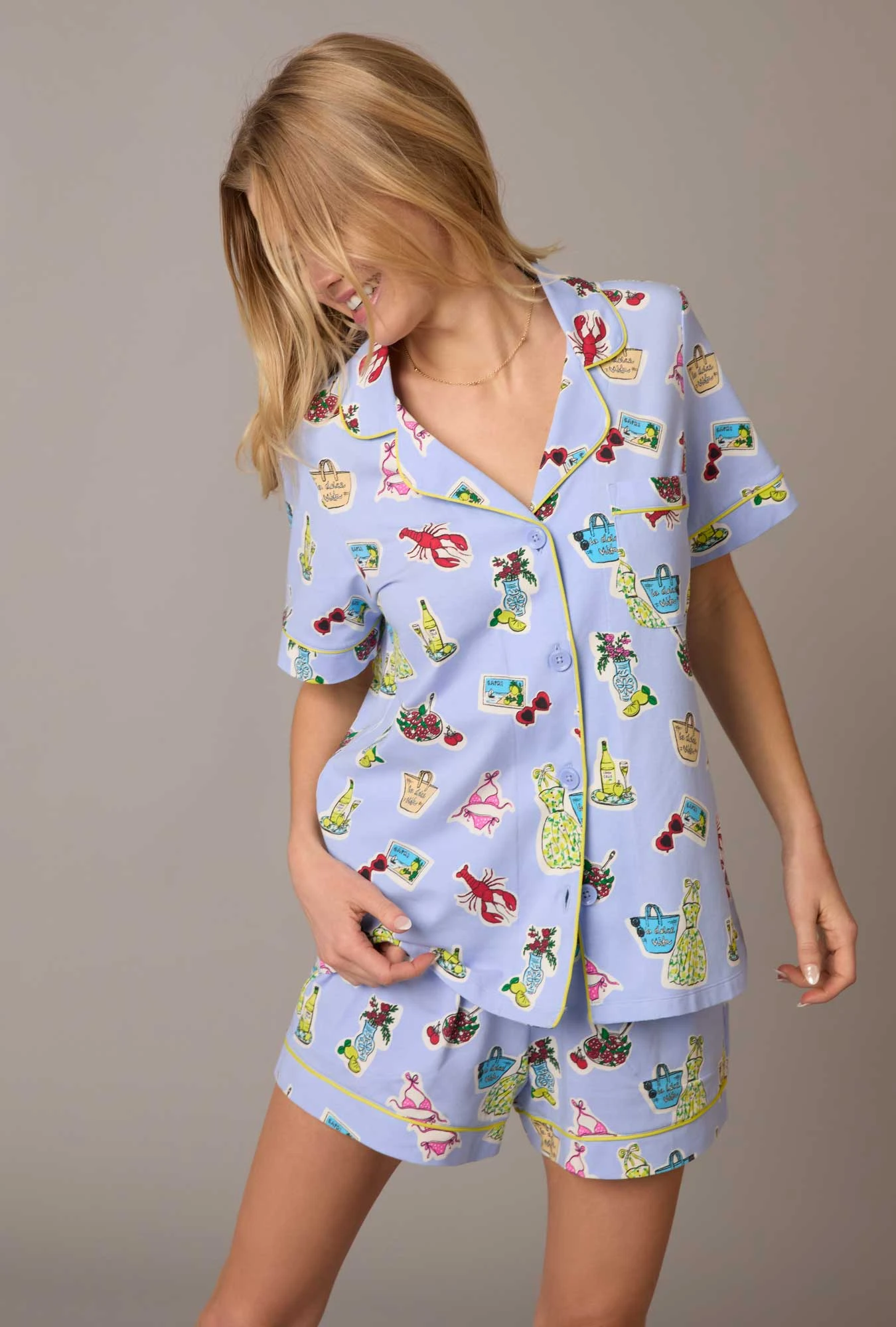 Our effortlessly chic short sleeve shorty pajama set in a blue beachy print is made from organically grown cotton jersey for ultimate comfort. The top features contrast piping around the collar and sleeves. The pull-on shorts have an elastic waistband and side pockets for added convenience.
