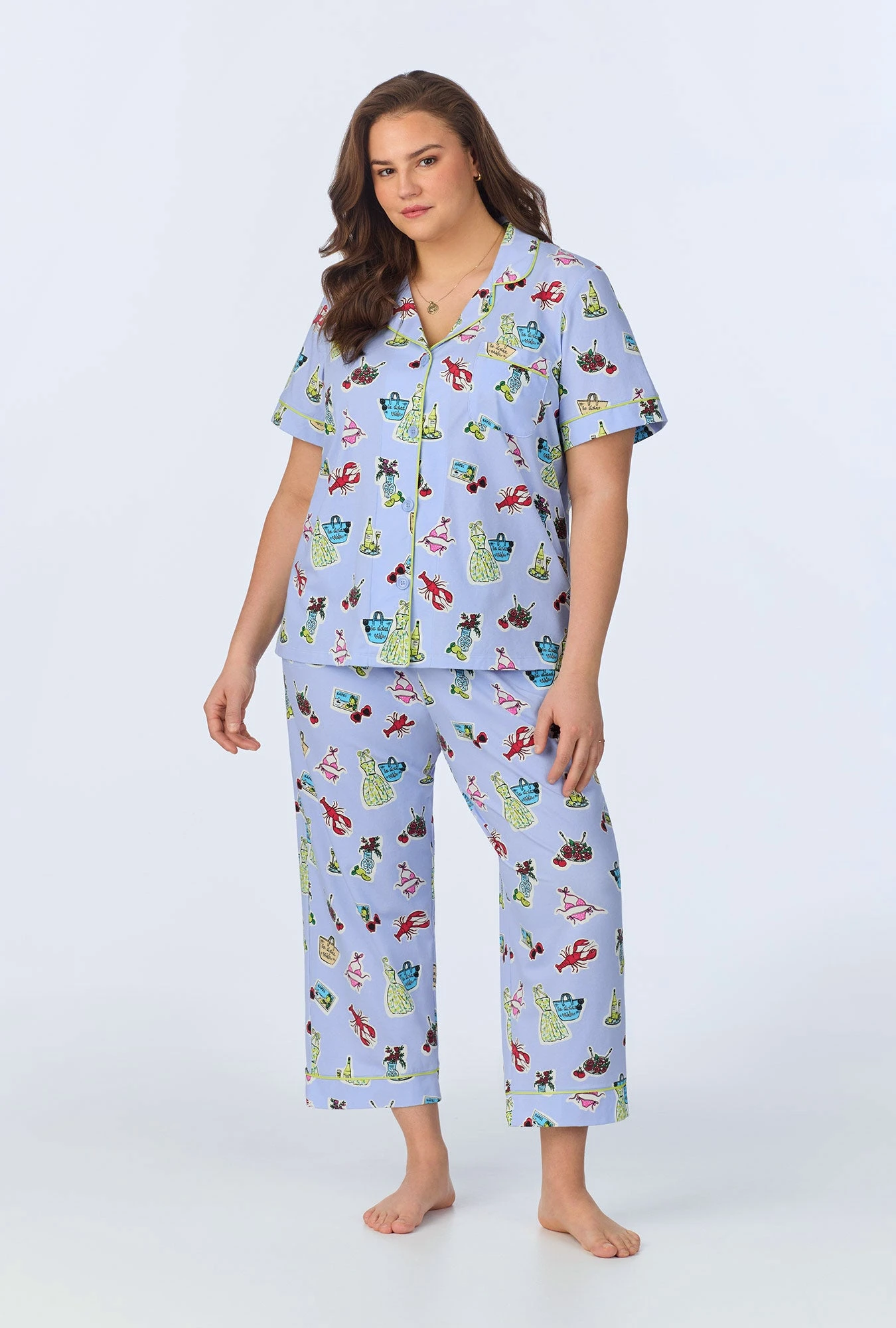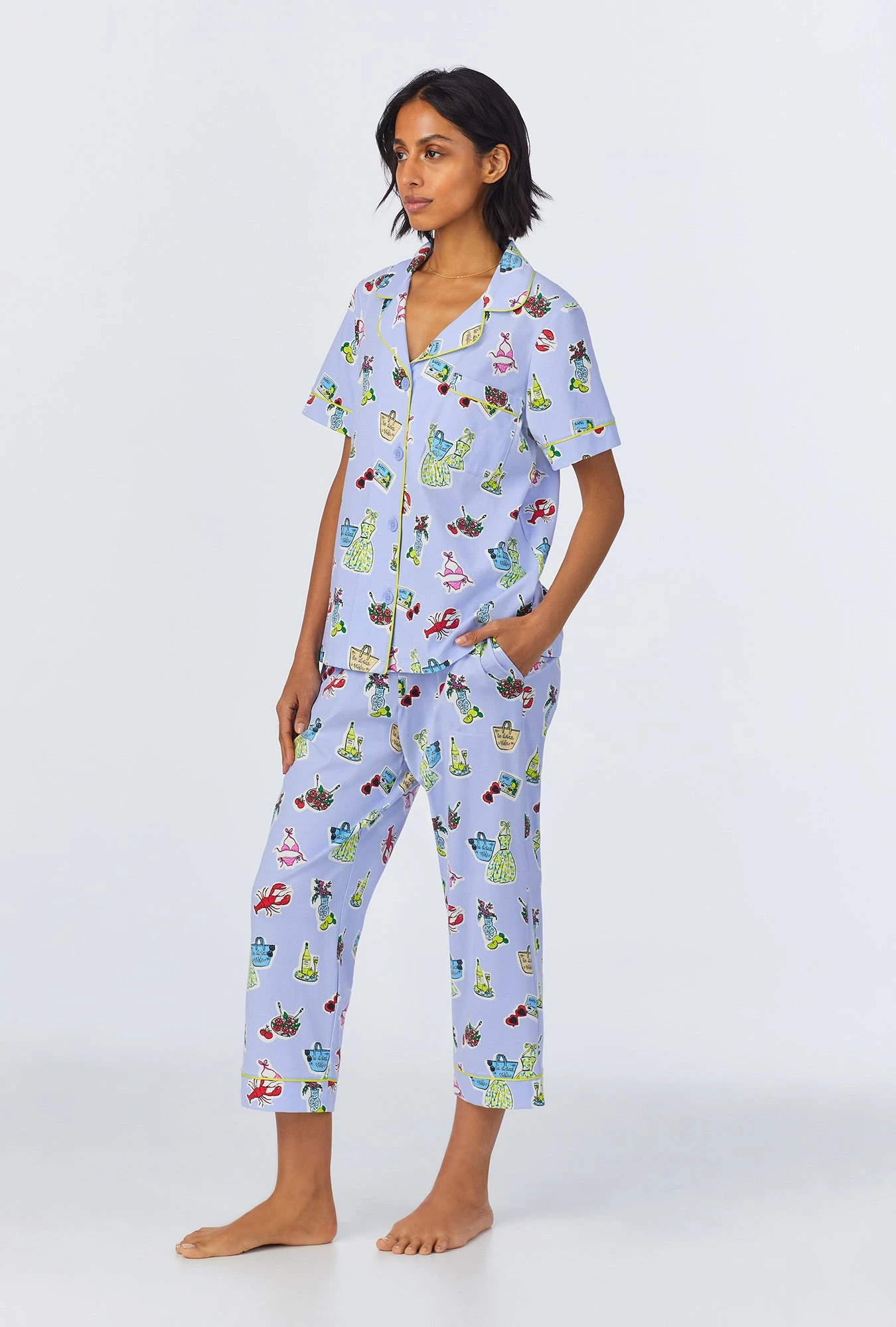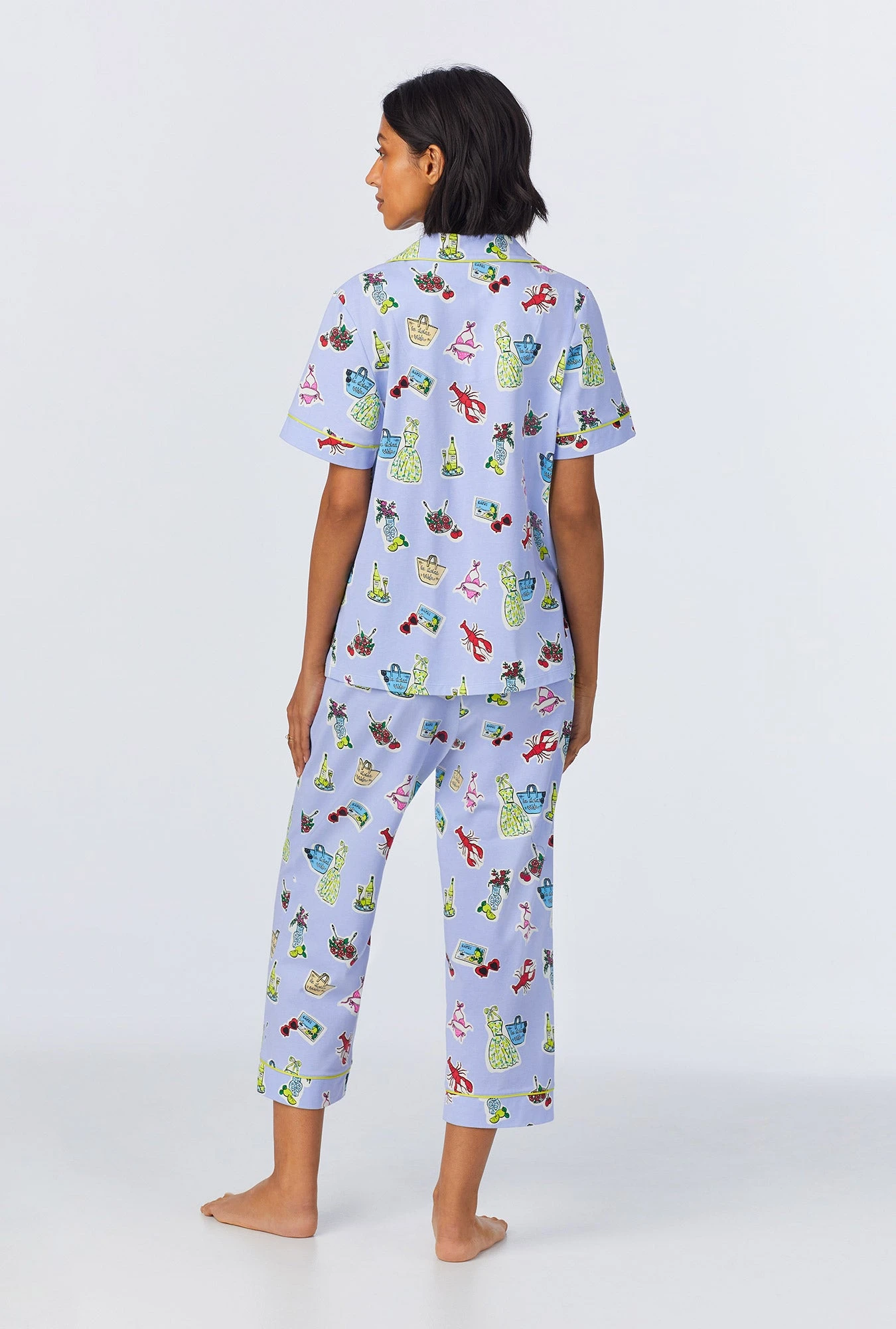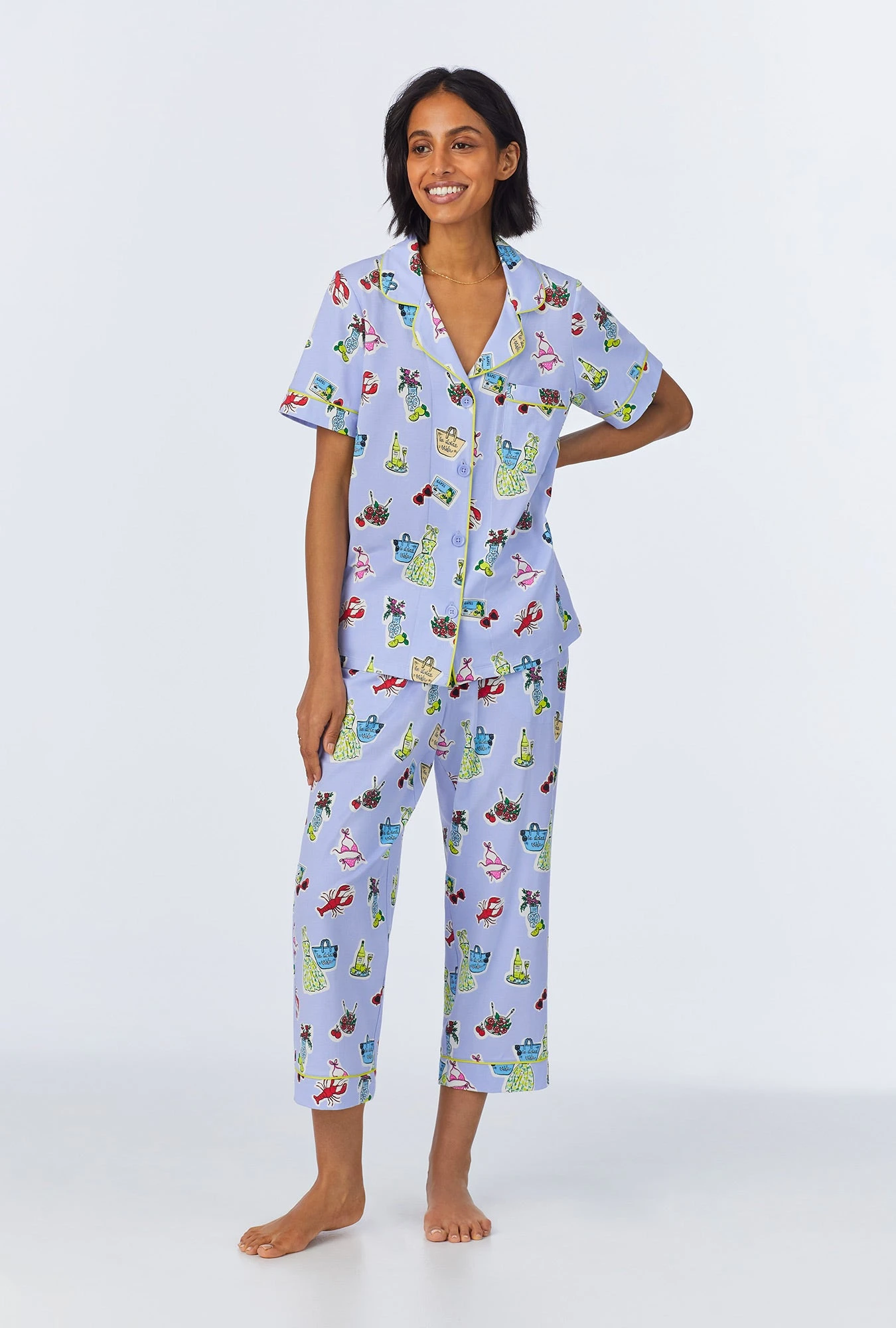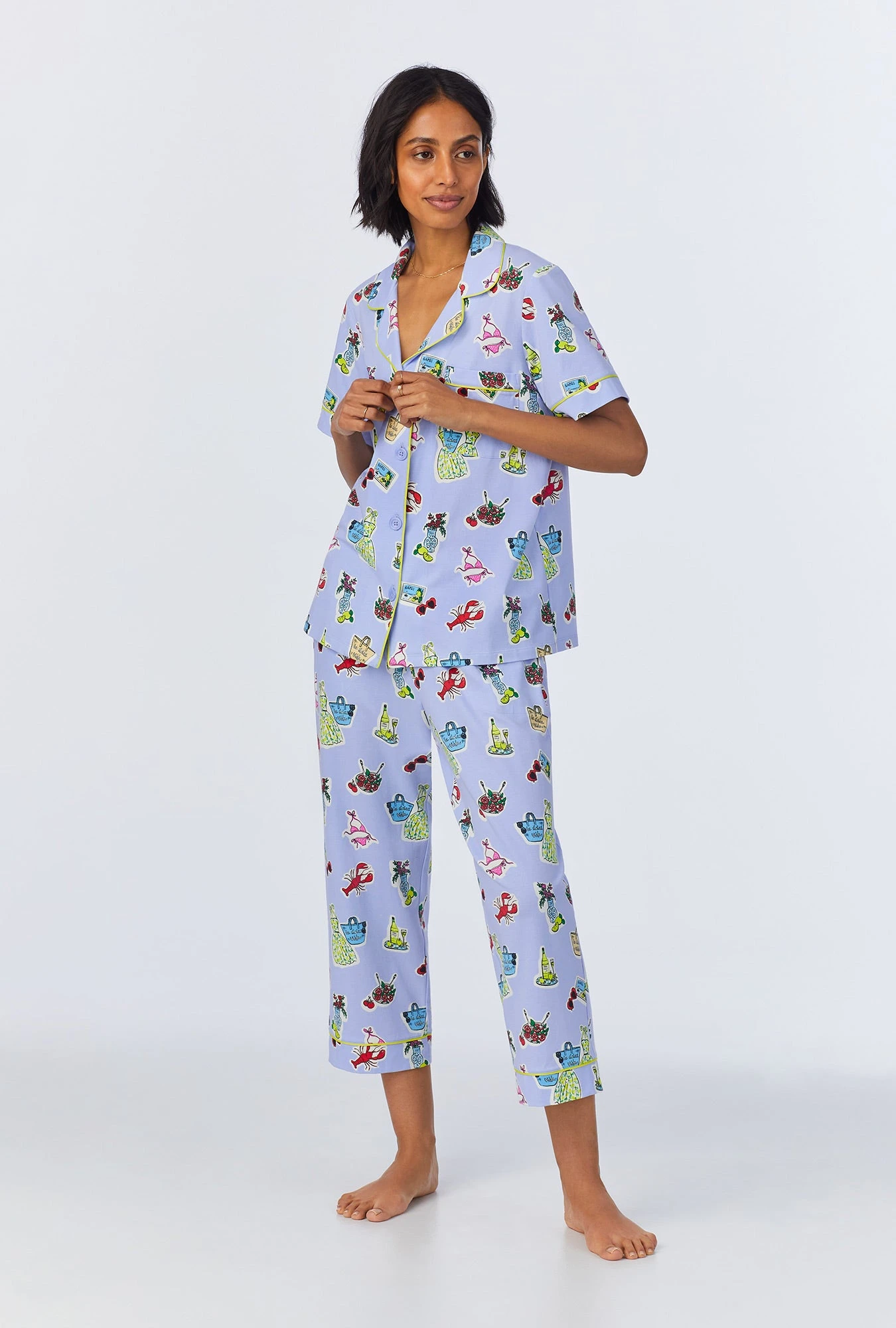 Our effortlessly chic short sleeve cropped pajama set in a blue beachy print is made from organically grown cotton jersey for ultimate comfort. The top features contrast piping around the collar and sleeves. The pull-on pants have an elastic waistband and side pockets for added convenience.