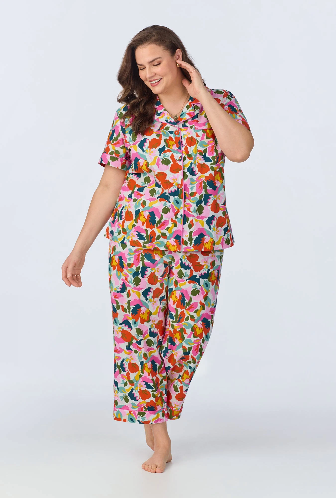 Our short sleeve cropped pajama set in a delicate floral print is made with organically grown woven cotton poplin. The top features contrast piping around the collar and sleeves. The pull-on cropped pants have an elastic waistband with a drawstring and side pockets.