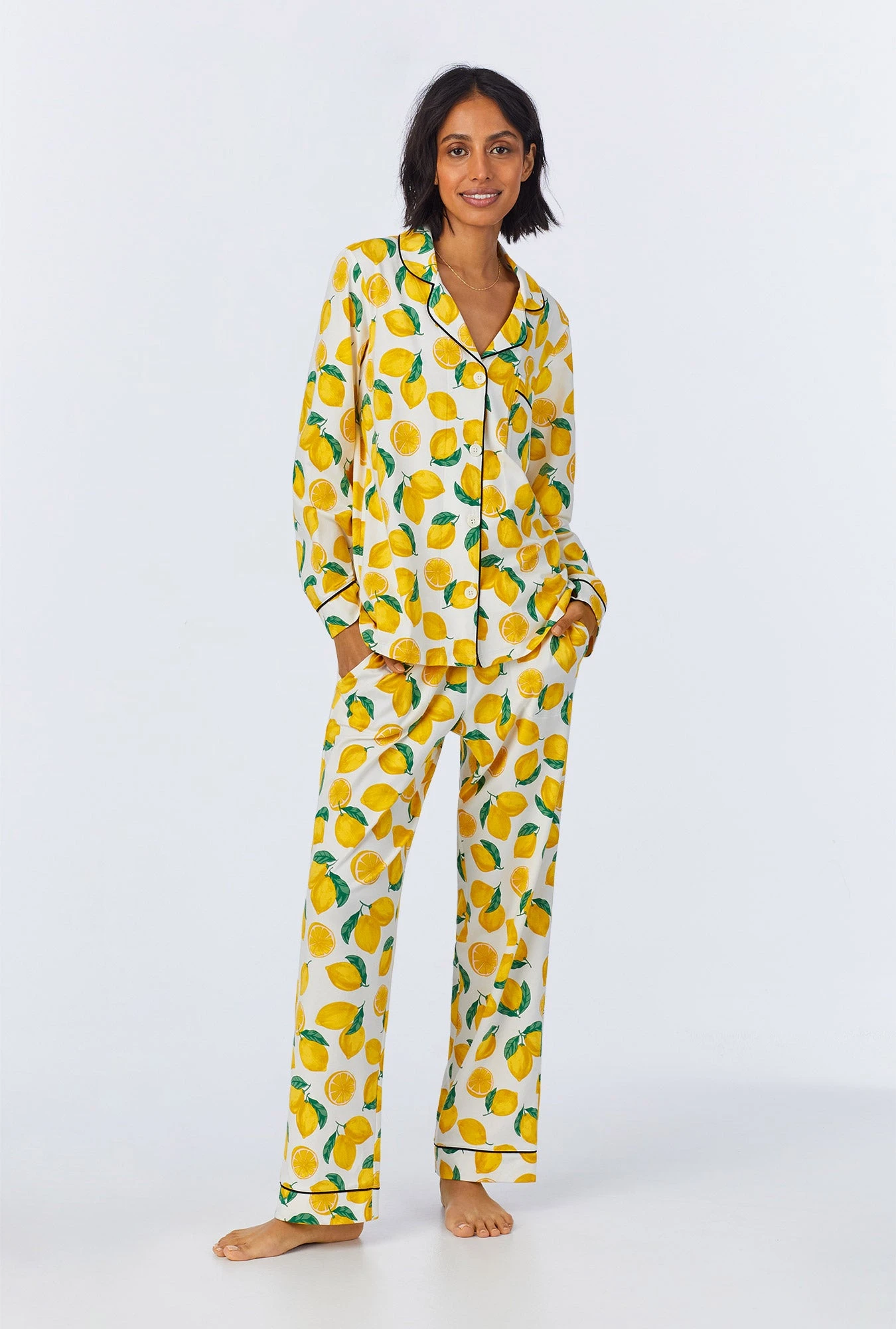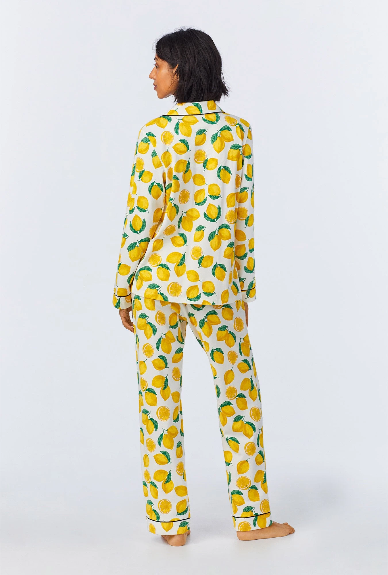 Vibrant and relaxed, the long sleeve classic pajama set in a lemon print is made from organically grown cotton jersey for a colorful, comfortable feel. The top has contrast piping around the collar and sleeves. The pull-on pants feature an elastic waistband and side pockets for convenience. This set is perfect for adding a pop of color to your sleepwear collection.