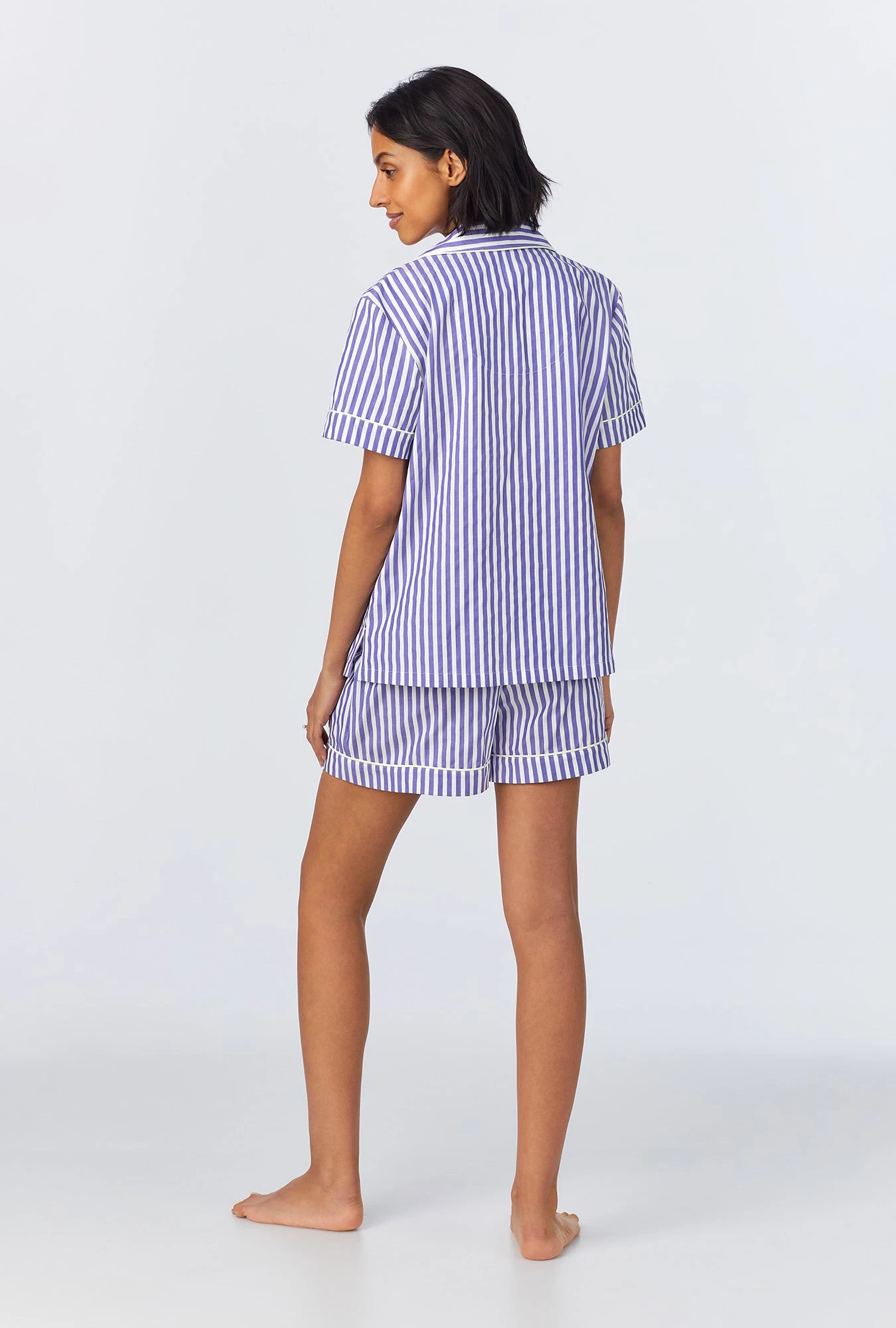 Our short sleeve shorty pajama set in a navy stripe made with organically grown woven cotton sateen offers comfort and style. The top features contrast piping around the notch collar and sleeve bands. The pull-on shorts have an elastic waistband with a drawstring and side pockets.