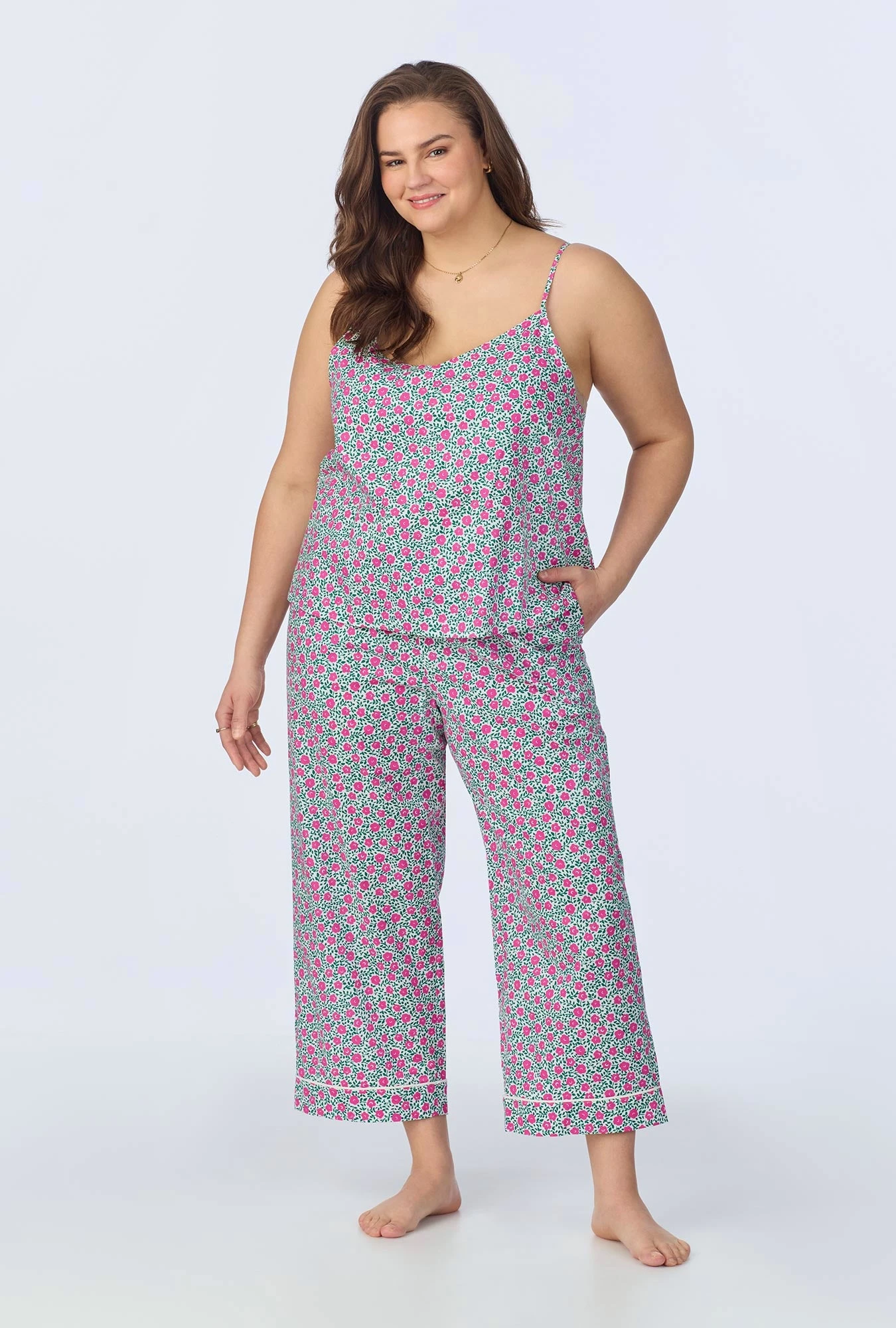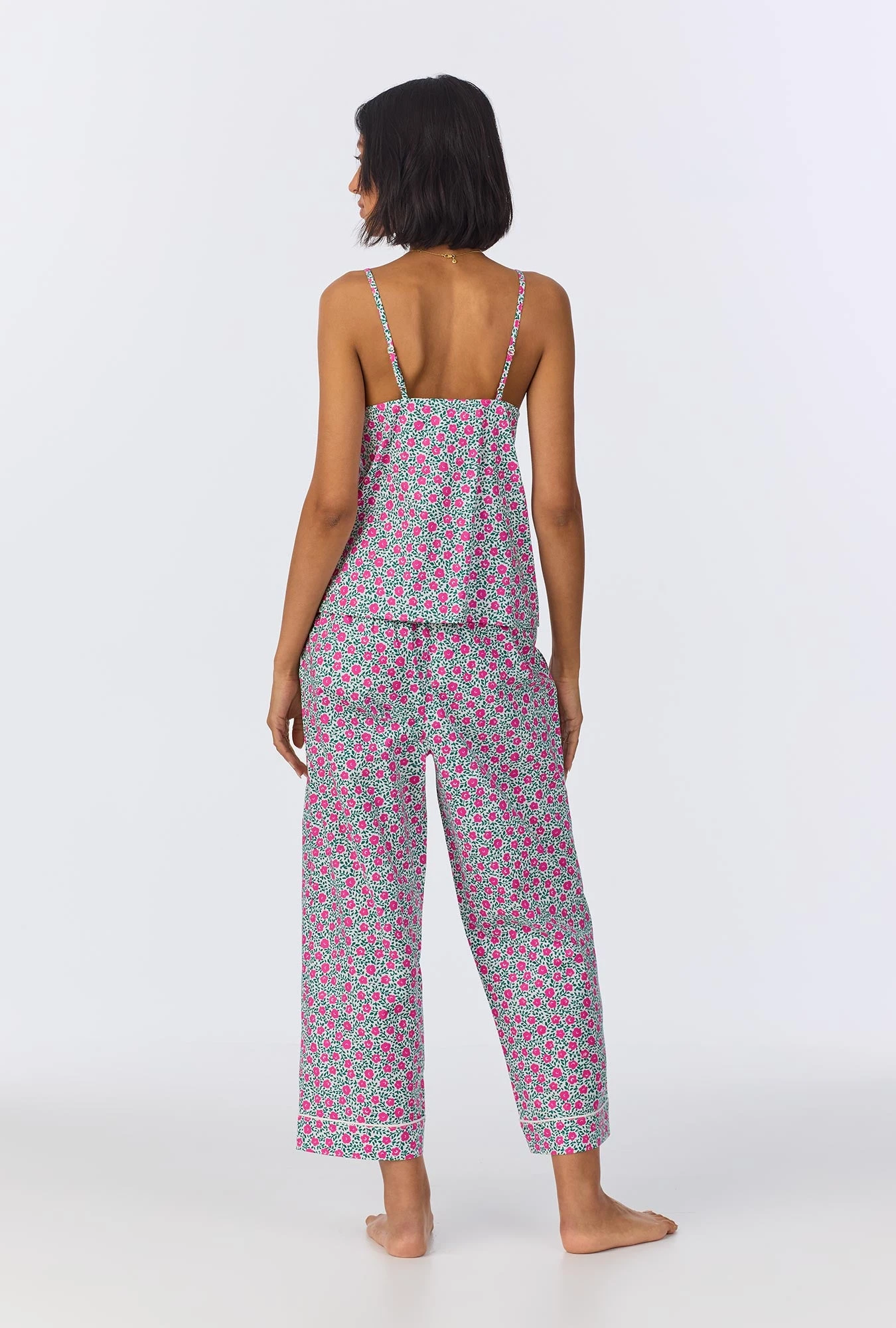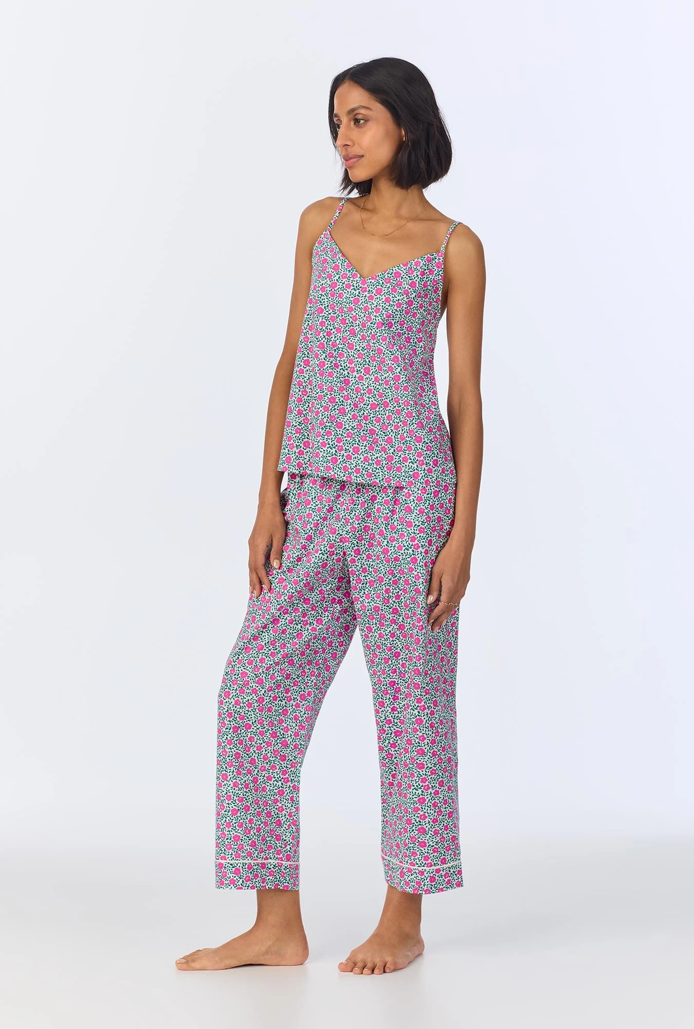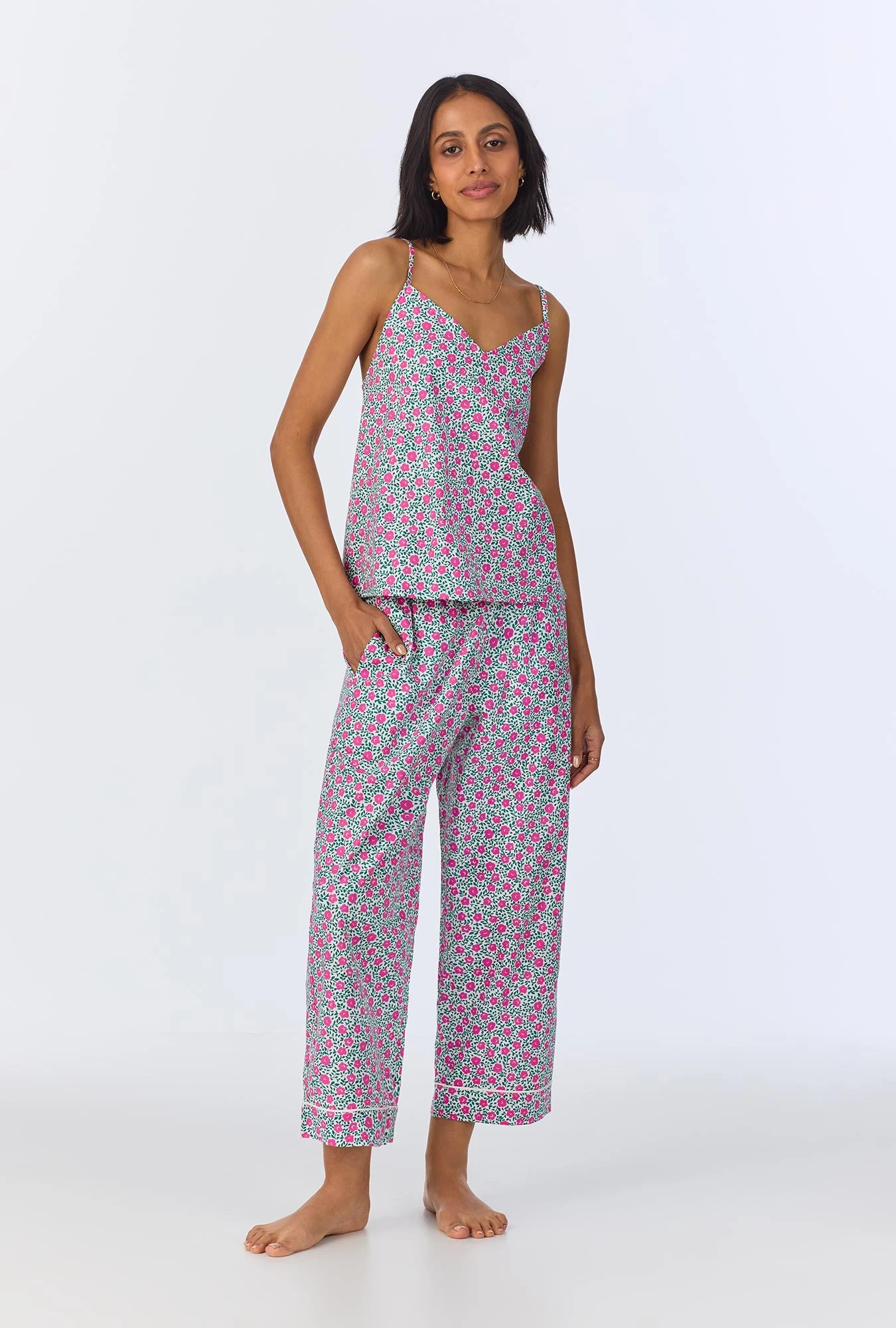 Our women’s cami top & cropped pant set in a dainty floral print is made with organically grown woven cotton poplin for a light, breathable feel. The top features adjustable spaghetti straps with a gold trim. The pull-on cropped pants have an elastic waistband with a drawstring and side pockets, a feminine and elegant addition to your sleepwear collection.