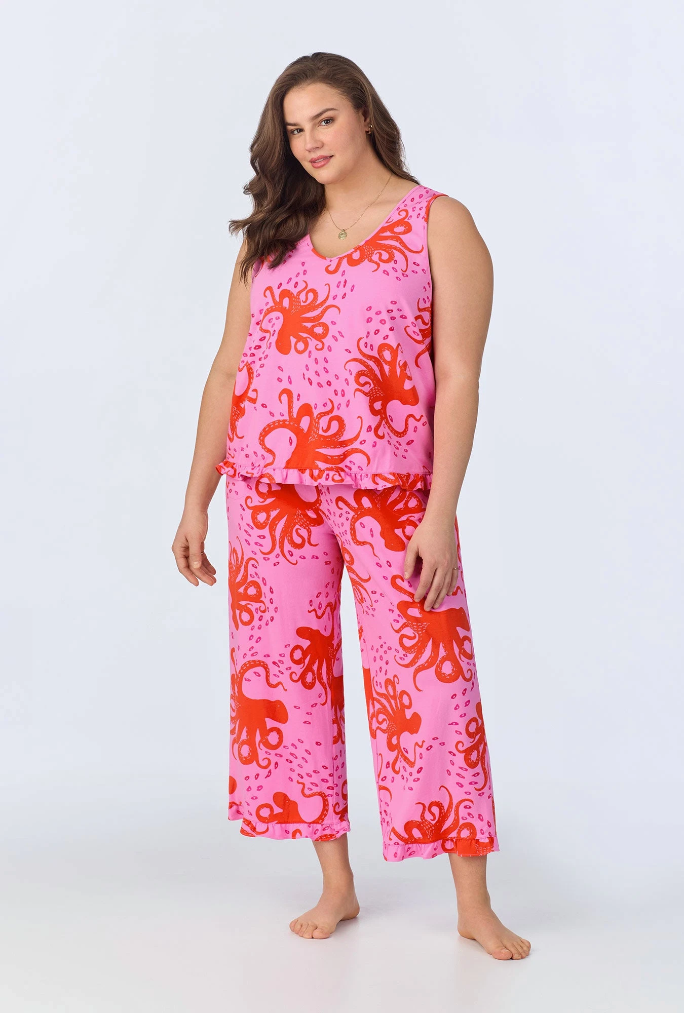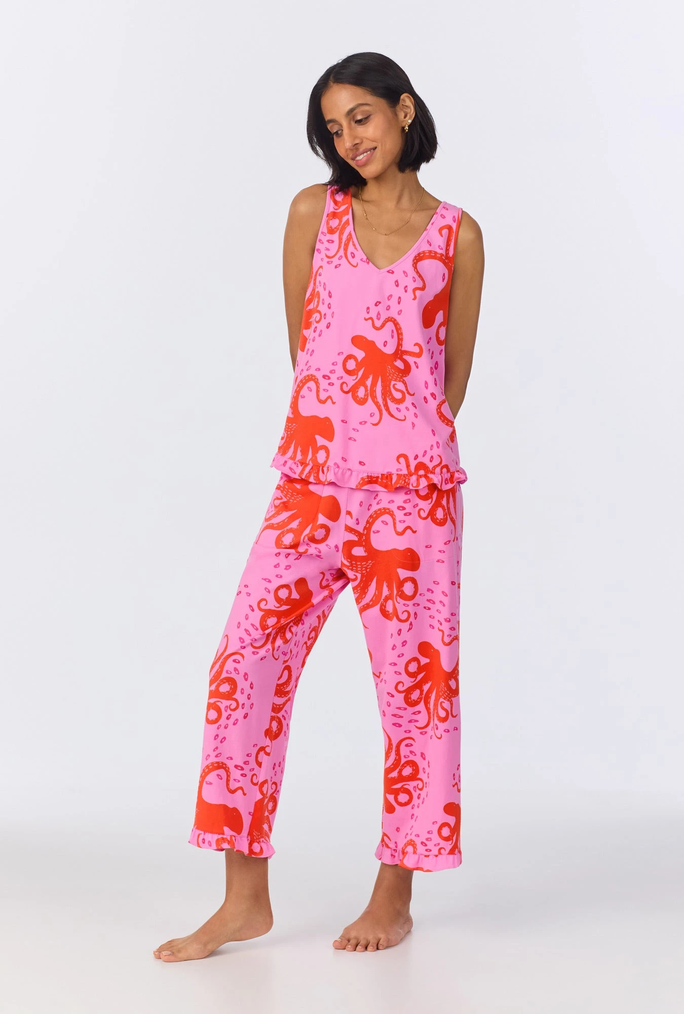 Soft and dreamy, our ruffle tank top and cropped pajama set in a pink and red oceanic themed print is made with organically grown cotton jersey for cozy comfort. The easy to wear v-neck top features soft ruffles. The pull-on cropped pant offers an elastic waistband with side pockets for a relaxed fit. This set is perfect for adding a touch of playfulness to your nighttime routine.