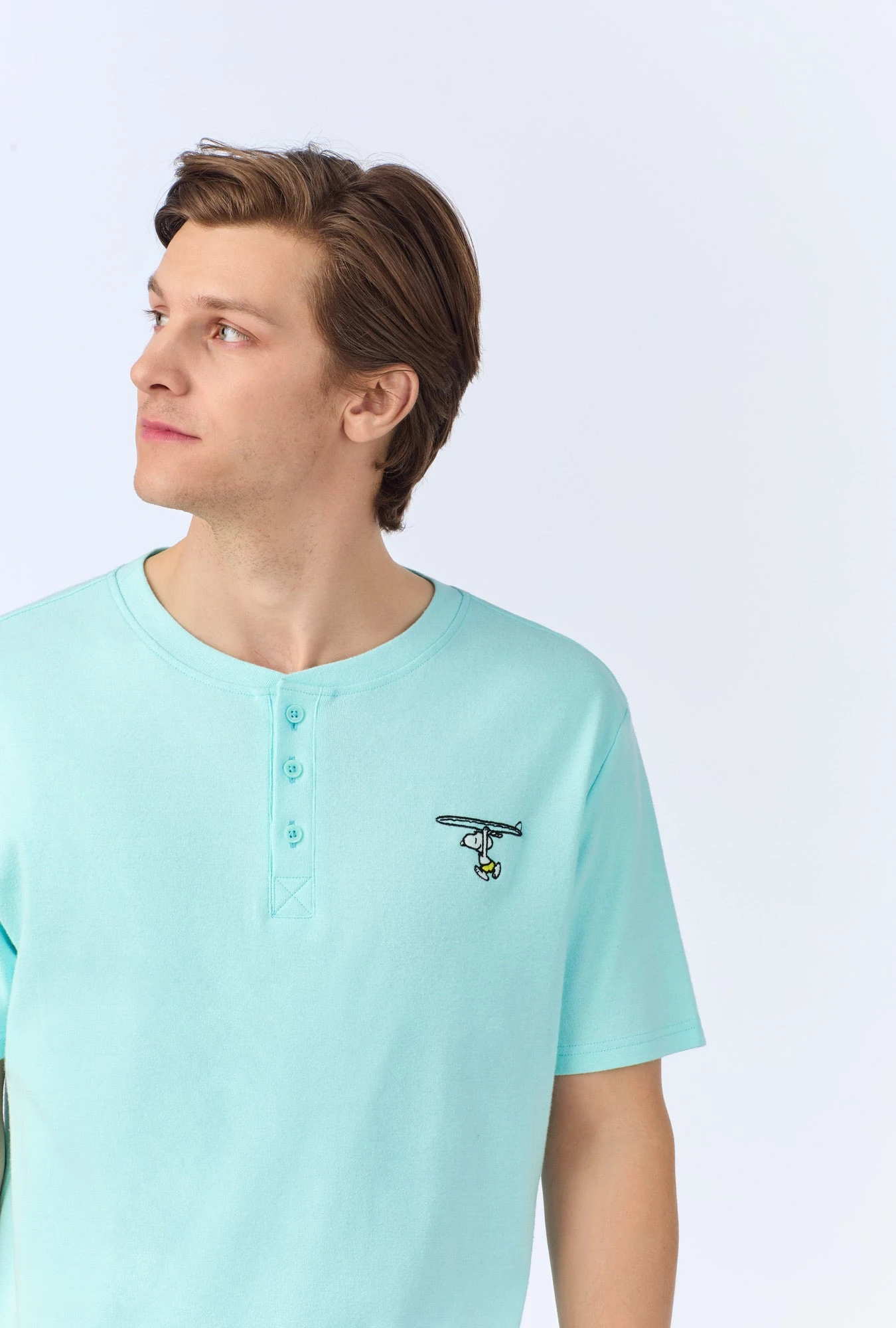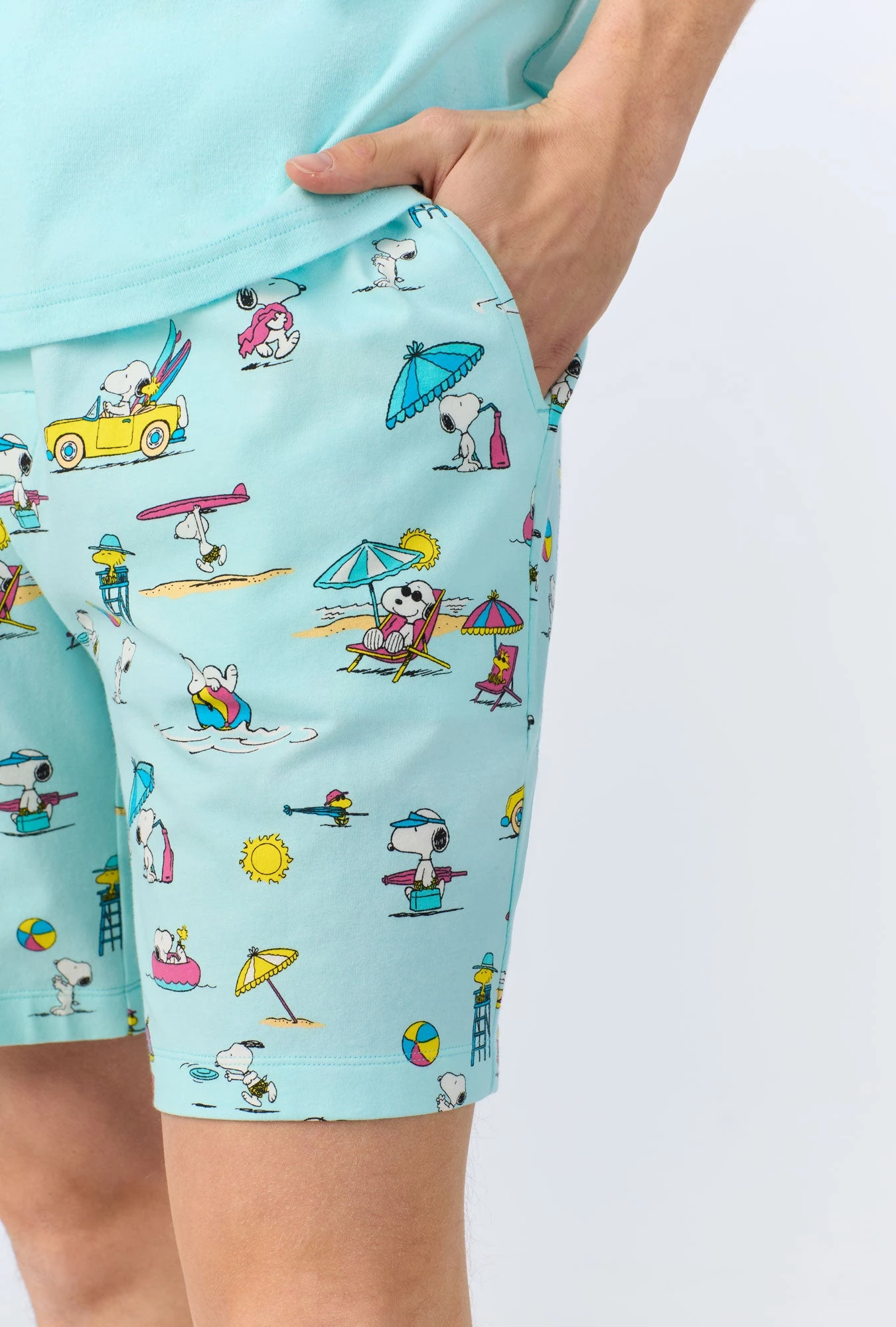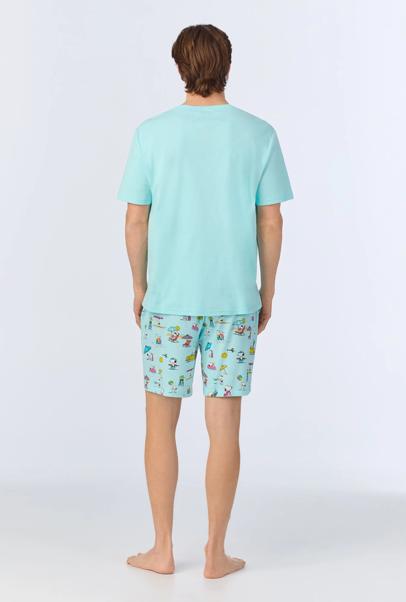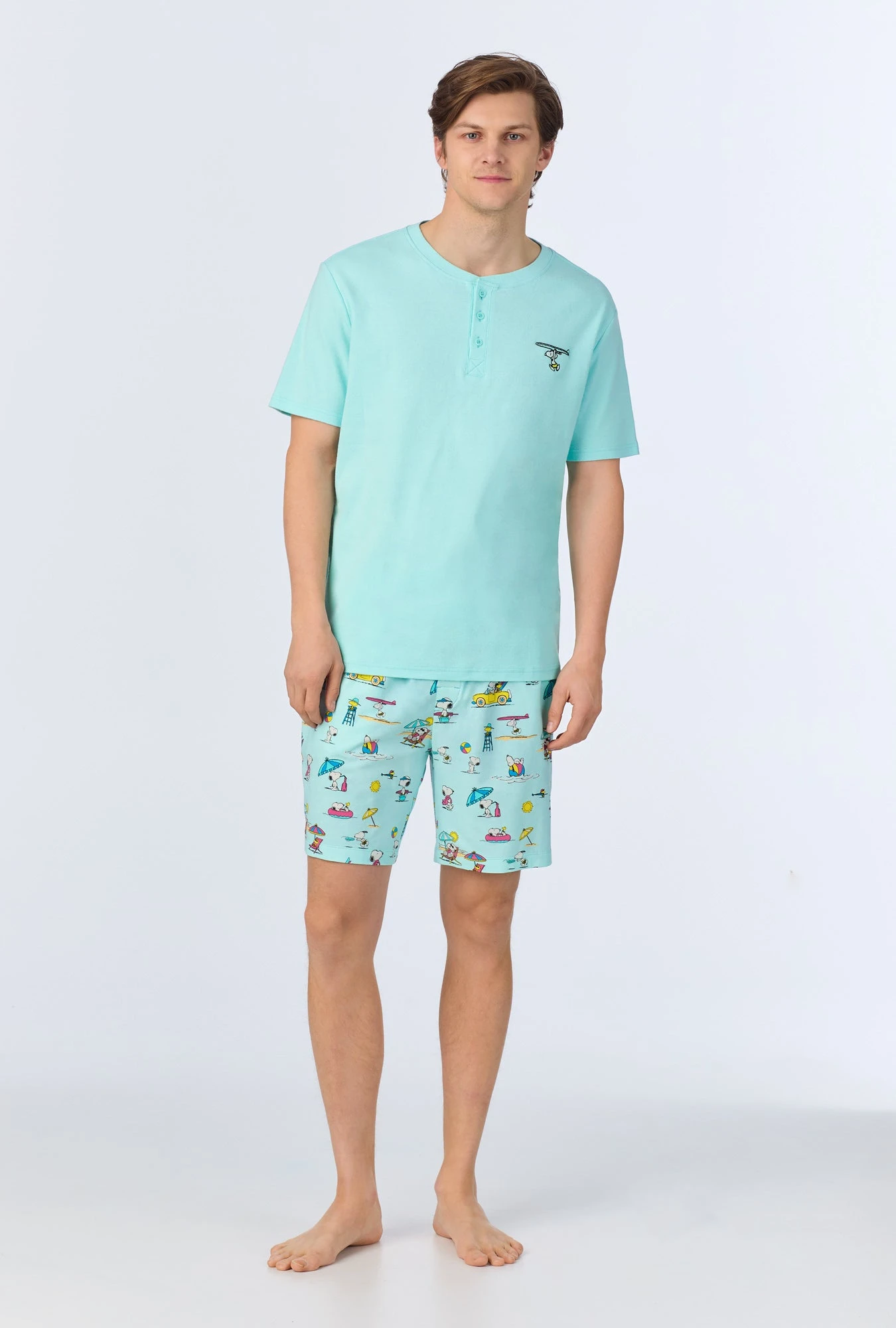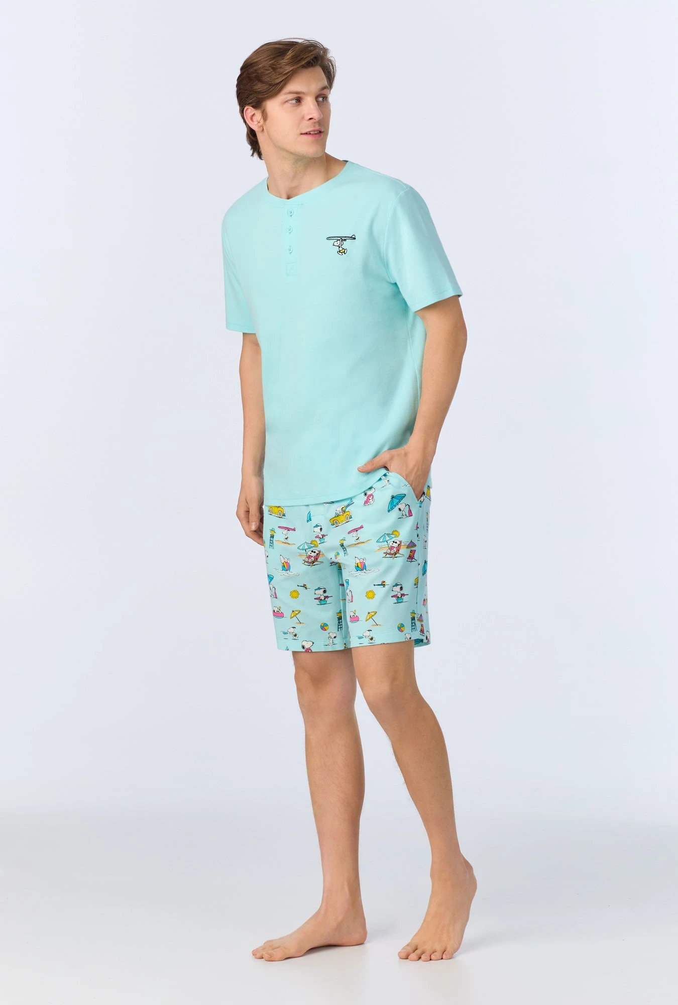Playful and fun, our men’s henley top and boxer pajama set in a beachy Snoopy print is made with organically grown cotton jersey for cozy comfort. The light blue top features a henley neckline with a summary up placket. The pull-on shorts have an elastic waistband with side pockets for an easy fit.