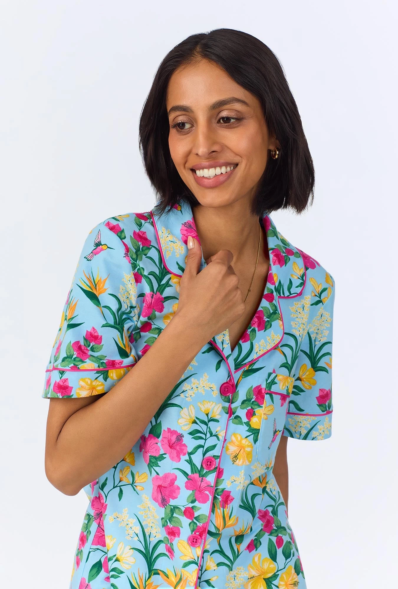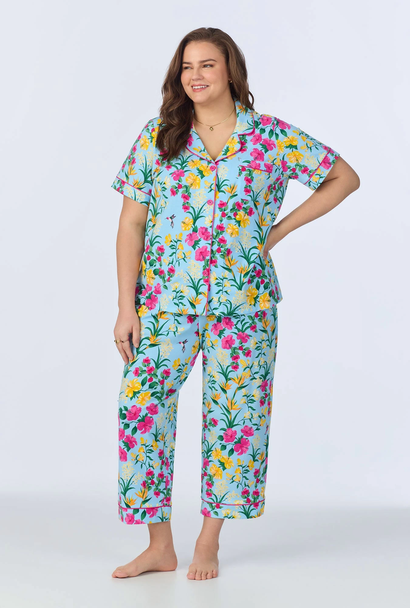 Our vibrant women’s short sleeve cropped pajama set in a blue tropical floral print is made with organically grown cotton jersey for cozy comfort. The top features contrast piping on the collar and sleeves. The pull-on pants have an elastic waistband with side pockets for easy comfort. This duo is the perfect addition to your summer sleepwear collection.