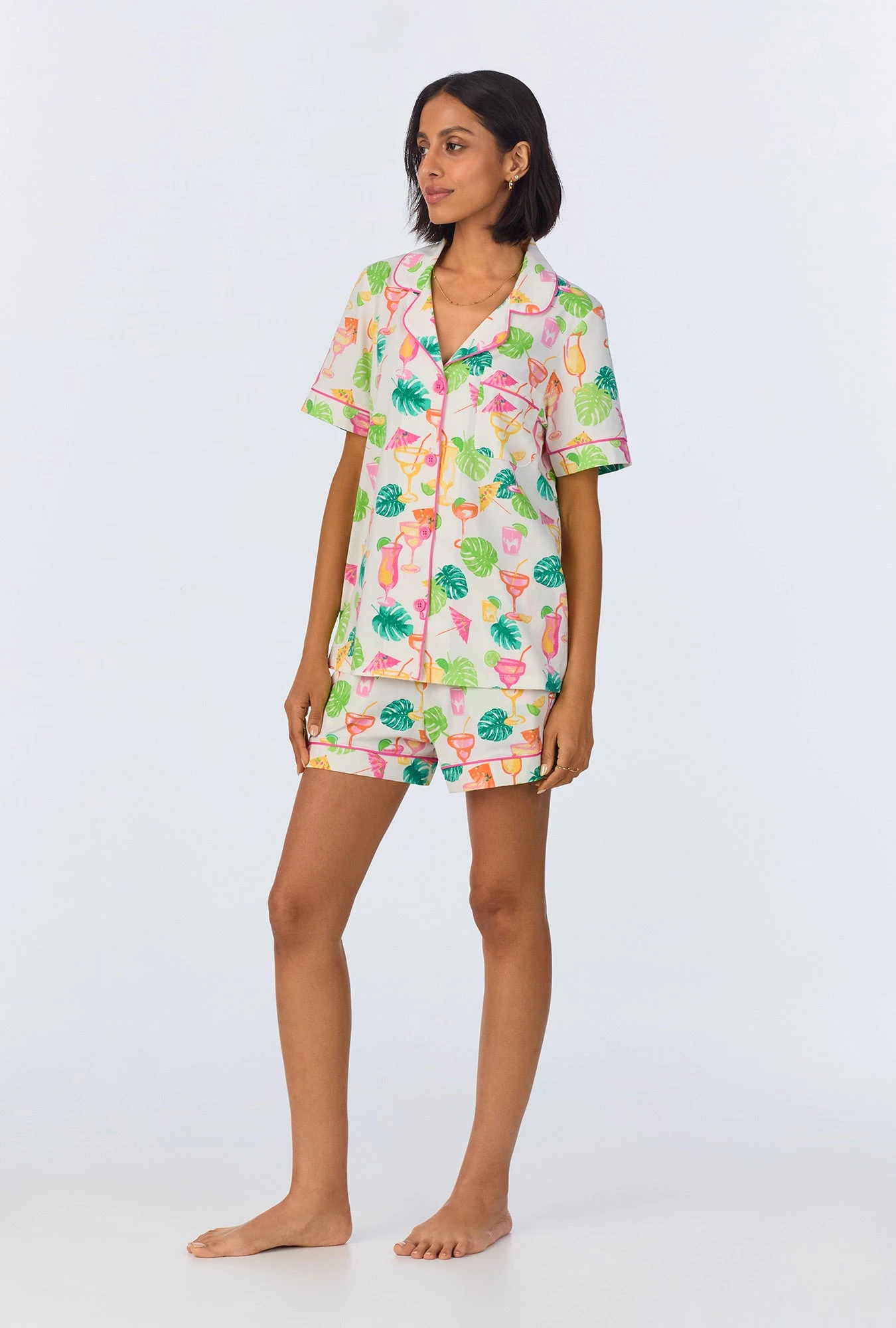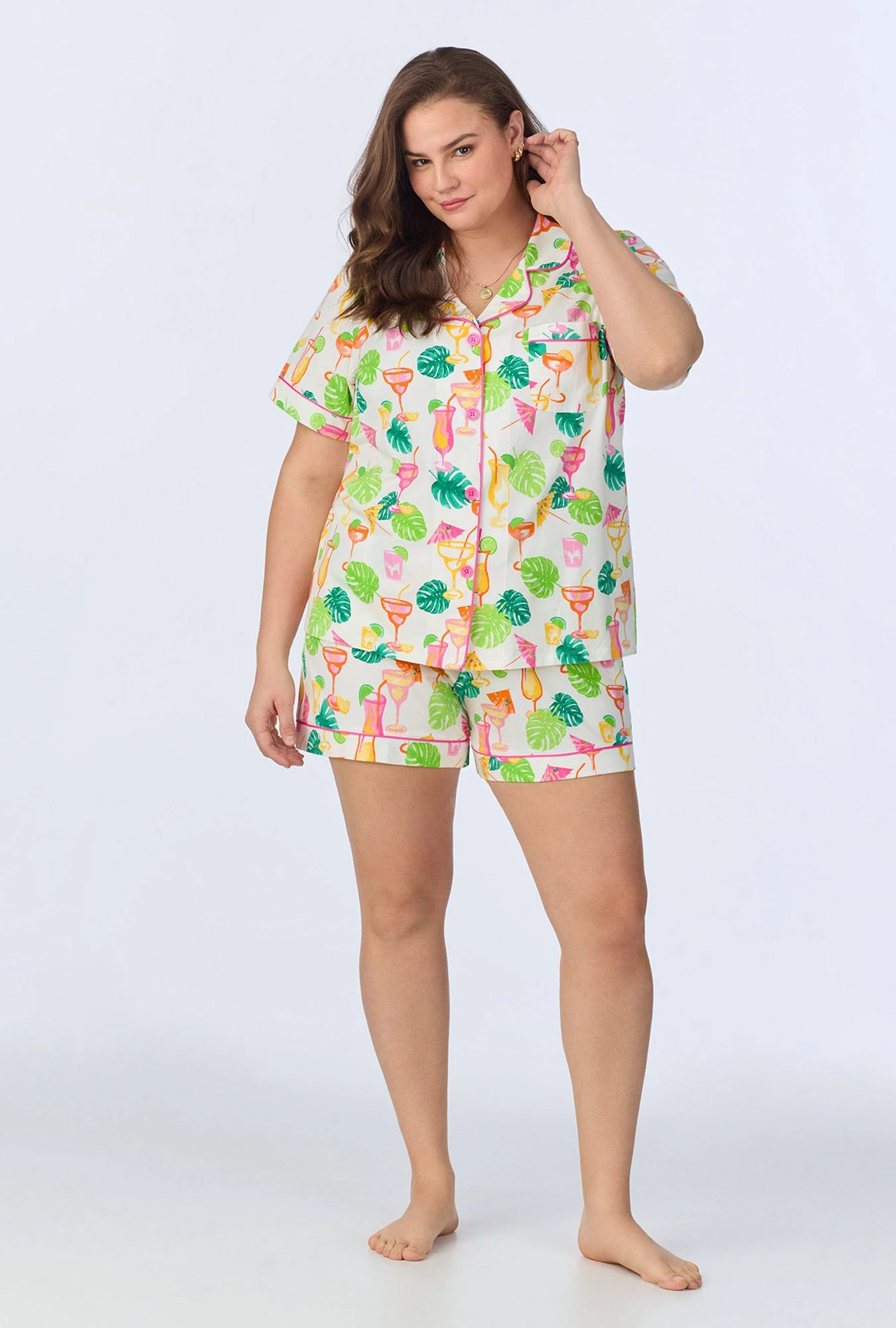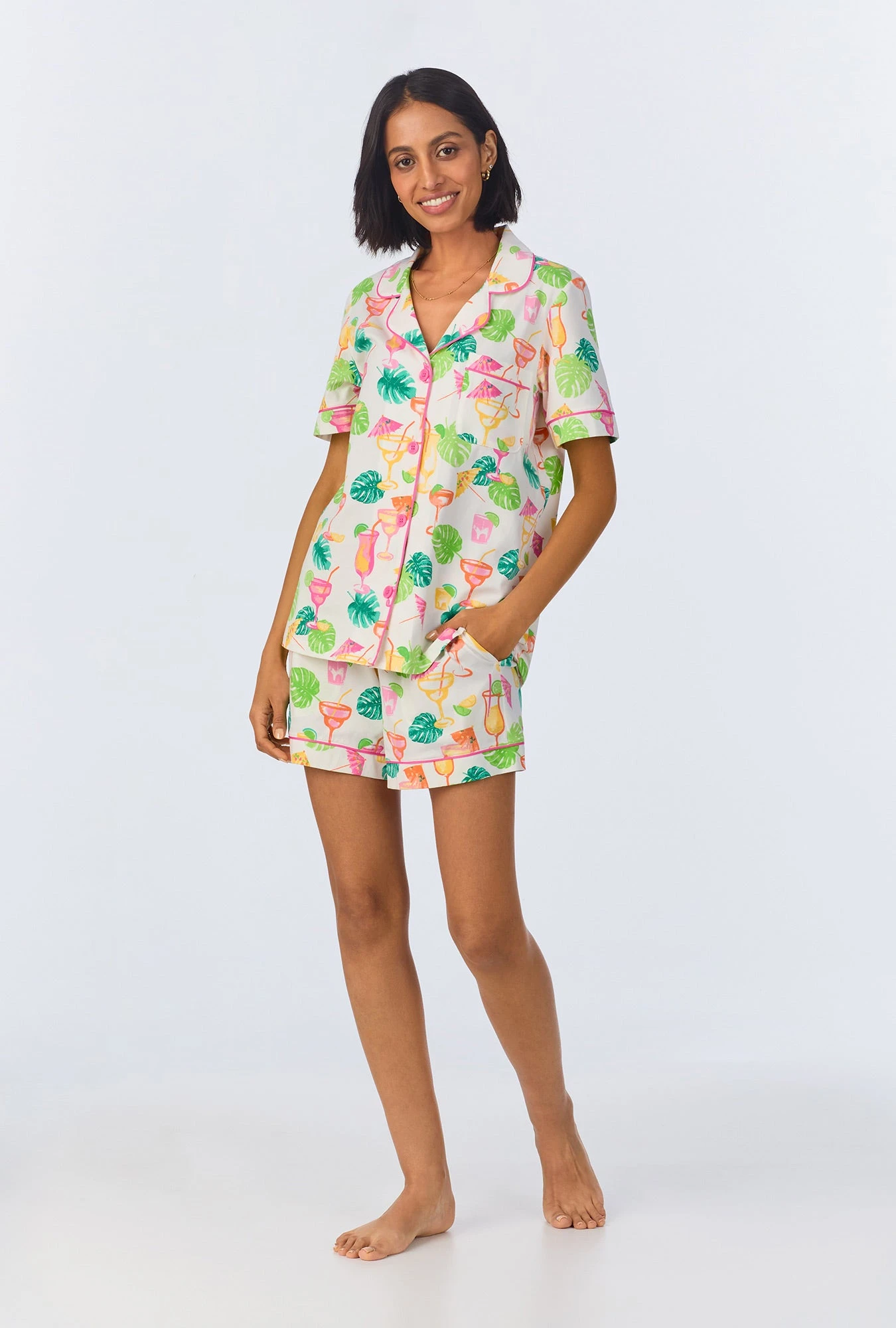 Our women’s short sleeve shorty pajama set in a tropical drink print is made with organically grown cotton jersey, perfect for vacation or warm nights in. The top features contrast piping around the collar and sleeves. The pull-on shorts have an elastic waistband with side pockets for easy wear.
