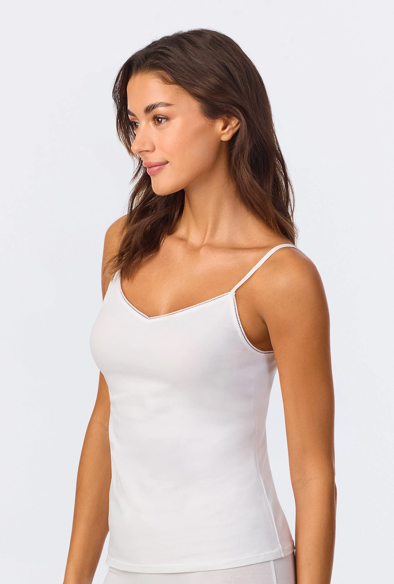 Your go to staple v-neckline cami combines functionality with feminine details. Featuring fully adjustable straps & nylon coated j-hook slides for custom adjustability. With an easy body skimming fit and delicate picot edge trim along neckline, this base layer essential is super cute and super comfortable.